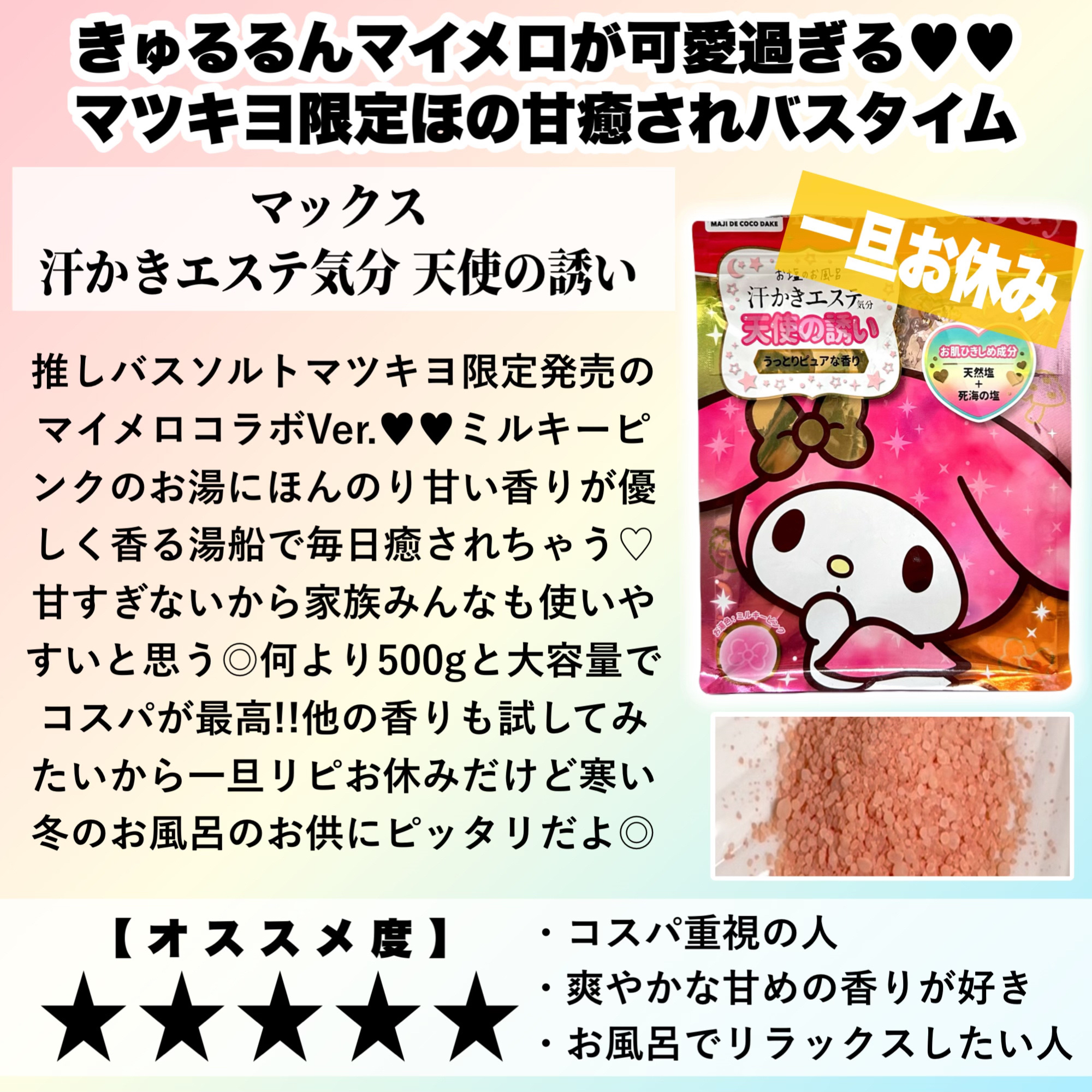 | ボディケアランキング第83位 | しっとりなめらかなお肌になるしとっても気に入ったバスソルト🛀 | 詳細を見る | |