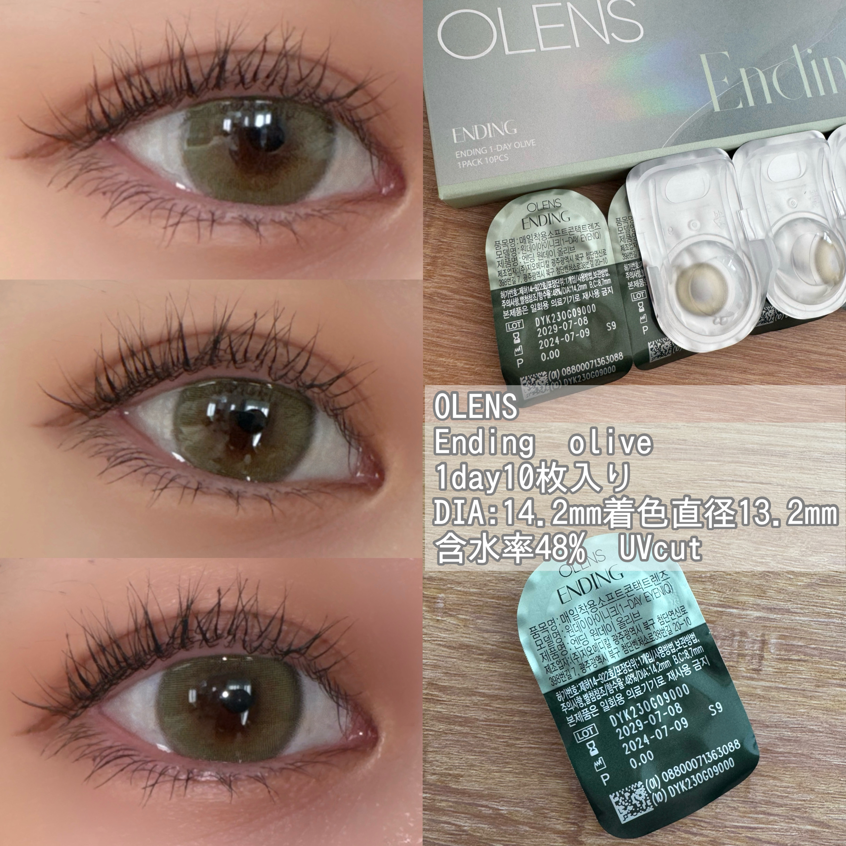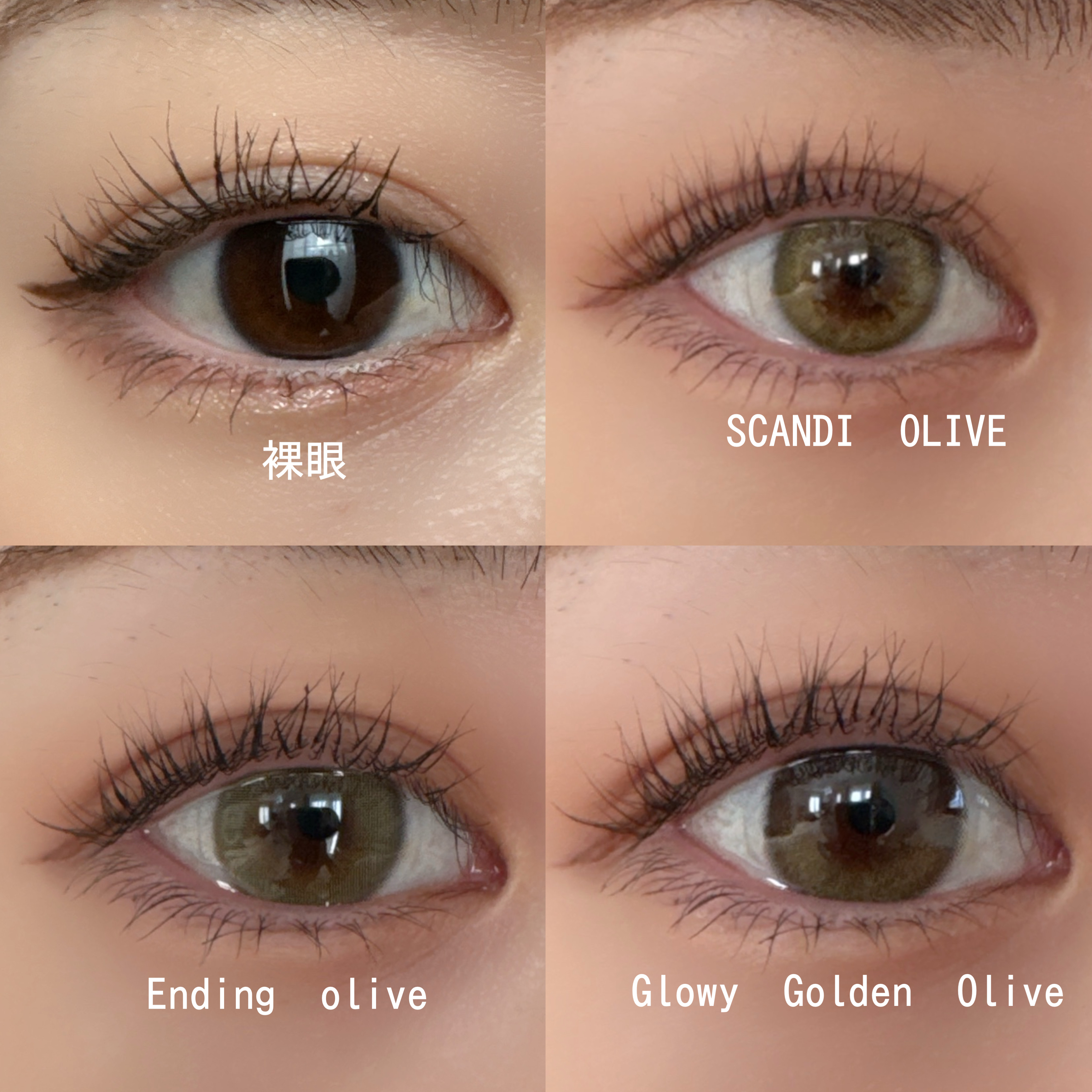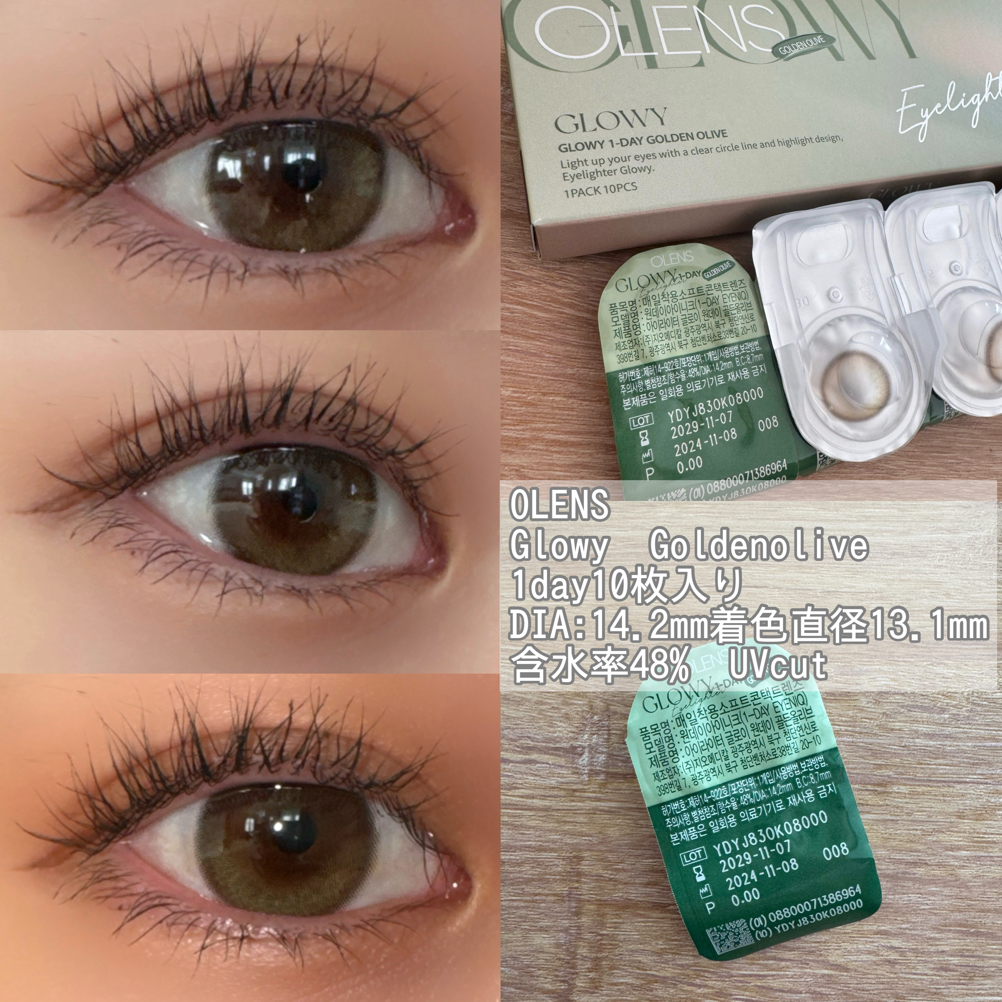 繊細なオリーブカラーのハイライターがアクセントになった水光カラコン🌙 ツヤ感と立体感のある瞳に仕上げてくれる✨ 裸眼風に溶け込むじゅんわりとした目元を演出してくれるカラコン👍🏻 はっきりとしたサークルラインと神秘的で絶妙なオリーブカラーがおしゃれなタイプ🌿 ゴールドメオリーブの高発色! ナチュラルハーフ系カラコン✨ フチなしの華やかなオリーブの虹彩🫒