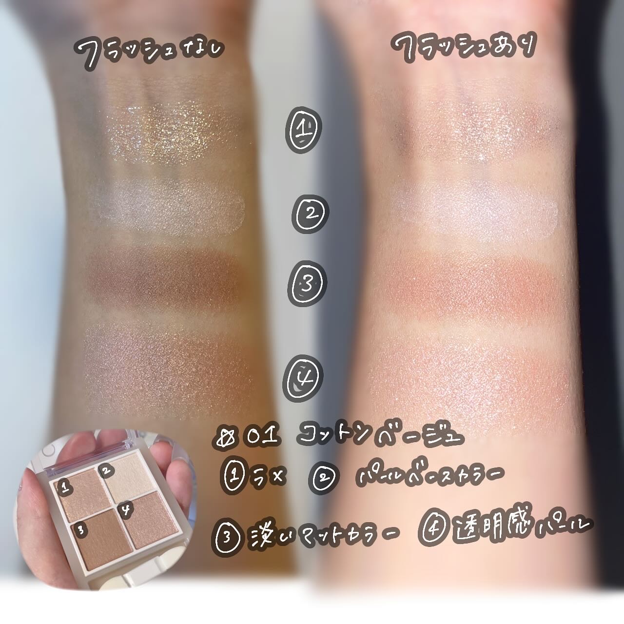 - ≪01 コットンベージュ≫ 〈A〉ジメチコン、タルク、トリ(カプリル酸/カプリン酸)グリセリル、(ジメチコン/ビニルジメチコン)クロスポリマー、カルナウバロウ、ラウロイルリシン、トコフェロール、スクワラン、ホホバ種子油、ホウケイ酸(Ca/Al)、マイカ、酸化チタン、酸化鉄 〈BCD〉タルク、リンゴ酸ジイソステアリル、ジメチコン、ジエチルヘキサン酸ネオペンチルグリコール、シリカ、ヘキサ(ヒドロキシステアリン酸/ステアリン酸/ロジン酸)ジペンタエリスリチル、クロルフェネシン、デヒドロ酢酸Na、セスキイソステアリン酸ソルビタン、ミリスチン酸亜鉛、水酸化Al、トコフェロール、スクワラン、ホホバ種子油、マイカ、酸化チタン、酸化鉄、ホウケイ酸(Ca/Al)、グンジョウ、酸化スズ ≪02 シェリーピンク≫ 〈A〉ジメチコン、タルク、(ジメチコン/ビニルジメチコン)クロスポリマー、トリ(カプリル酸/カプリン酸)グリセリル、カルナウバロウ、ラウロイルリシン、シリカ、トコフェロール、スクワラン、ホホバ種子油、ホウケイ酸(Ca/Al)、マイカ、酸化チタン、酸化鉄、酸化スズ、グンジョウ、コンジョウ 〈BCD〉タルク、リンゴ酸ジイソステアリル、ジメチコン、ジエチルヘキサン酸ネオペンチルグリコール、シリカ、ヘキサ(ヒドロキシステアリン酸/ステアリン酸/ロジン酸)ジペンタエリスリチル、クロルフェネシン、デヒドロ酢酸Na、セスキイソステアリン酸ソルビタン、ミリスチン酸亜鉛、水酸化Al、トコフェロール、スクワラン、ホホバ種子油、マイカ、酸化チタン、酸化鉄、ホウケイ酸(Ca/Al)、グンジョウ、赤226 ≪03 ムーンアメジスト≫ 〈A〉ジメチコン、タルク、(ジメチコン/ビニルジメチコン)クロスポリマー、トリ(カプリル酸/カプリン酸)グリセリル、カルナウバロウ、ラウロイルリシン、トコフェロール、スクワラン、ホホバ種子油、ホウケイ酸(Ca/Al)、マイカ、酸化チタン、酸化鉄 〈BCD〉タルク、リンゴ酸ジイソステアリル、ジメチコン、ジエチルヘキサン酸ネオペンチルグリコール、シリカ、ヘキサ(ヒドロキシステアリン酸/ステアリン酸/ロジン酸)ジペンタエリスリチル、クロルフェネシン、デヒドロ酢酸Na、セスキイソステアリン酸ソルビタン、ミリスチン酸亜鉛、水酸化Al、トコフェロール、スクワラン、ホホバ種子油、マイカ、酸化チタン、酸化鉄、ホウケイ酸(Ca/Al)、グンジョウ、赤226、酸化スズ