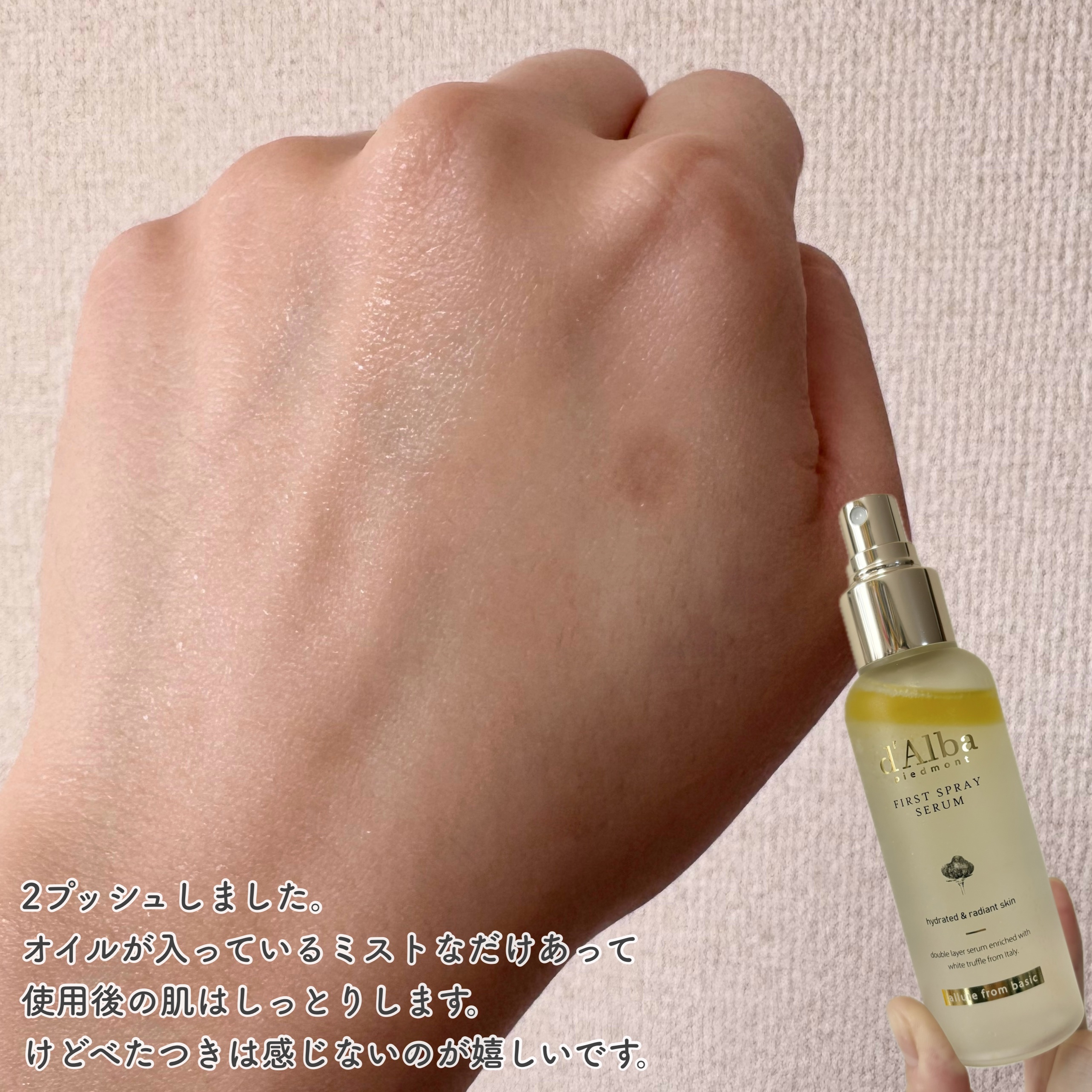 大好きなダルバ!もうこのスプレーセラムは3本目!♡ 子供とお風呂からあがって、ほかほかの我が子の体を拭いて、保湿をして、パジャマを着させて... オイルinなのでしっかり潤いも感じられる◎ 昔は脂性肌、今は混合肌かな?なんて自分では思っている肌質タイプの人ですが、オイルinでもベタつきや重たさは感じず心地よく使えています☺︎ ホワイトトリュフファーストスプレーセラムのおかげで肌の治安が保たれています♡ メイクの上から乾燥が気になる時にも使えるようですが、出先でも自分のことは二の次三の次の子育て中なので、私はバタバタするお風呂上がりの一発目としての使用一択です!笑