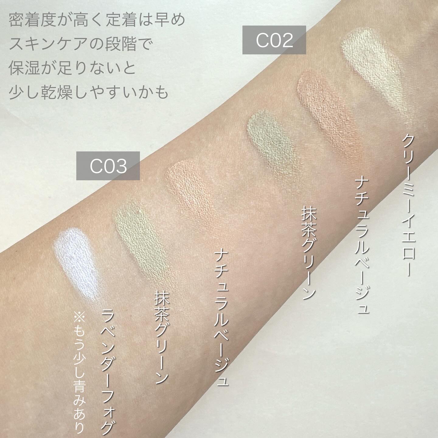 - <C01> ジメチコン、シクロペンタシロキサン、ラウリン酸イソアミル、イソノナン酸イソノニル、(ビニルジメチコン/メチコンシルセスキオキサン)クロスポリマー、マイカ、合成ワックス、オリーブ油脂肪酸ソルビタン、ヘキサ(ヒドロキシステアリン酸/ステアリン酸/ロジン酸)ジペンタエリスリチル、マイクロクリスタリンワックス、ホウケイ酸(Ca/Na)、フェニルトリメチコン、水添ポリイソブテン、ポリリシノレイン酸ポリグリセリル-6、(VP/ヘキサデセン)コポリマー、セスキオレイン酸ソルビタン、水添ポリデセン、トリエトキシカプリリルシラン、水酸化Al、カプリル酸グリセリル、カプリリルグリコール、ジステアルジモニウムヘクトライト、ハイドロゲンジメチコン、スクワラン、水、グリセリン、スベリヒユエキス、BG、トリ(カプリル酸/カプリン酸)グリセリル、セラミドNP、水添レシチン、1,2-ヘキサンジオール、ヒアルロン酸Na、ツボクサエキス、酸化チタン、酸化鉄、酸化亜鉛、ビスジグリセリルポリアシルアジペート-2、オクテニルコハク酸デンプンAl、ポリメチルシルセスキオキサン、シリカ <C02> ジメチコン、フェニルトリメチコン、ラウリン酸イソアミル、イソノナン酸イソノニル、合成ワックス、水添ポリイソブテン、ビスジグリセリルポリアシルアジペート-2、オクテニルコハク酸デンプンAl、マイクロクリスタリンワックス、ポリメチルシルセスキオキサン、オリーブ油脂肪酸ソルビタン、マイカ、シリカ、水添ポリデセン、(VP/ヘキサデセン)コポリマー、ポリリシノレイン酸ポリグリセリル-6、ヘキサ(ヒドロキシステアリン酸/ステアリン酸/ロジン酸)ジペンタエリスリチル、セスキオレイン酸ソルビタン、トリエトキシカプリリルシラン、水酸化Al、カプリル酸グリセリル、カプリリルグリコール、ジステアルジモニウムヘクトライト、スクワラン、水、グリセリン、スベリヒユエキス、BG、トリ(カプリル酸/カプリン酸)グリセリル、セラミドNP、水添レシチン、1,2-ヘキサンジオール、ヒアルロン酸Na、ツボクサエキス、酸化チタン、酸化鉄、酸化クロム、酸化鉄 <C03> ジメチコン、フェニルトリメチコン、ラウリン酸イソアミル、イソノナン酸イソノニル、合成ワックス、水添ポリイソブテン、ビスジグリセリルポリアシルアジペート-2、オクテニルコハク酸デンプンAl、マイクロクリスタリンワックス、ポリメチルシルセスキオキサン、オリーブ油脂肪酸ソルビタン、マイカ、シリカ、水添ポリデセン、(VP/ヘキサデセン)コポリマー、ポリリシノレイン酸ポリグリセリル-6、ヘキサ(ヒドロキシステアリン酸/ステアリン酸/ロジン酸)ジペンタエリスリチル、セスキオレイン酸ソルビタン、トリエトキシカプリリルシラン、水酸化Al、カプリル酸グリセリル、カプリリルグリコール、ジステアルジモニウムヘクトライト、スクワラン、水、グリセリン、スベリヒユエキス、BG、トリ(カプリル酸/カプリン酸)グリセリル、セラミドNP、水添レシチン、1,2-ヘキサンジオール、ヒアルロン酸Na、ツボクサエキス、酸化チタン、酸化鉄、グンジョウ、酸化クロム