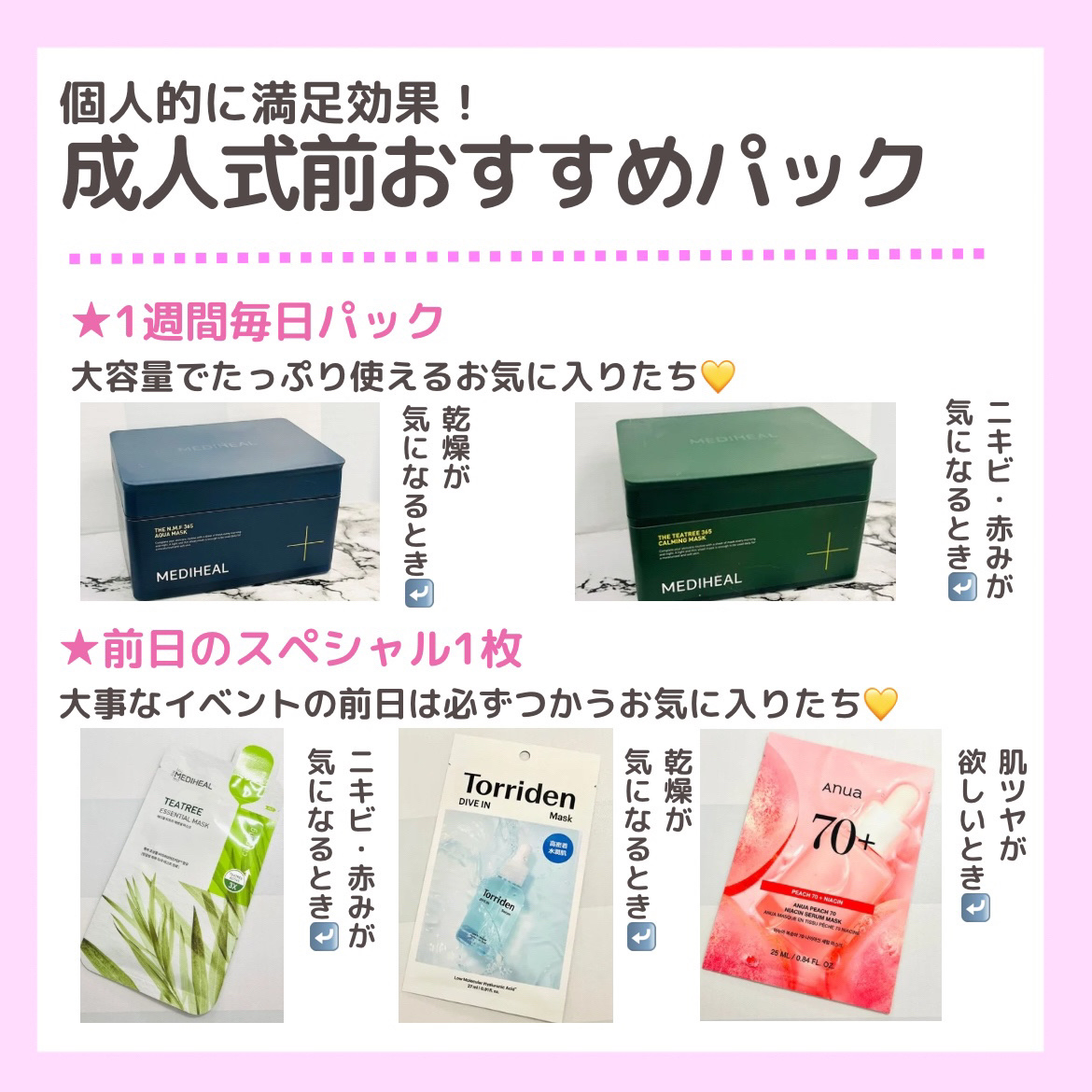 フェイスパックといえば「メディヒール」✨ 初めて使った日のあの衝撃は今も忘れられない🫨 🟢THEティーツリー 365カーミングマスク たっぷり含んだティツリー成分が🌿 敏感な肌を落ち着かせてうるおいとツヤのある肌へ💗 🔵THE N.M.F 365アクアマスク 高保湿成分HYDRODEEPER と8種のヒアルロン酸が 乾燥したお肌をしっとりとしたハリのある肌へ💓
