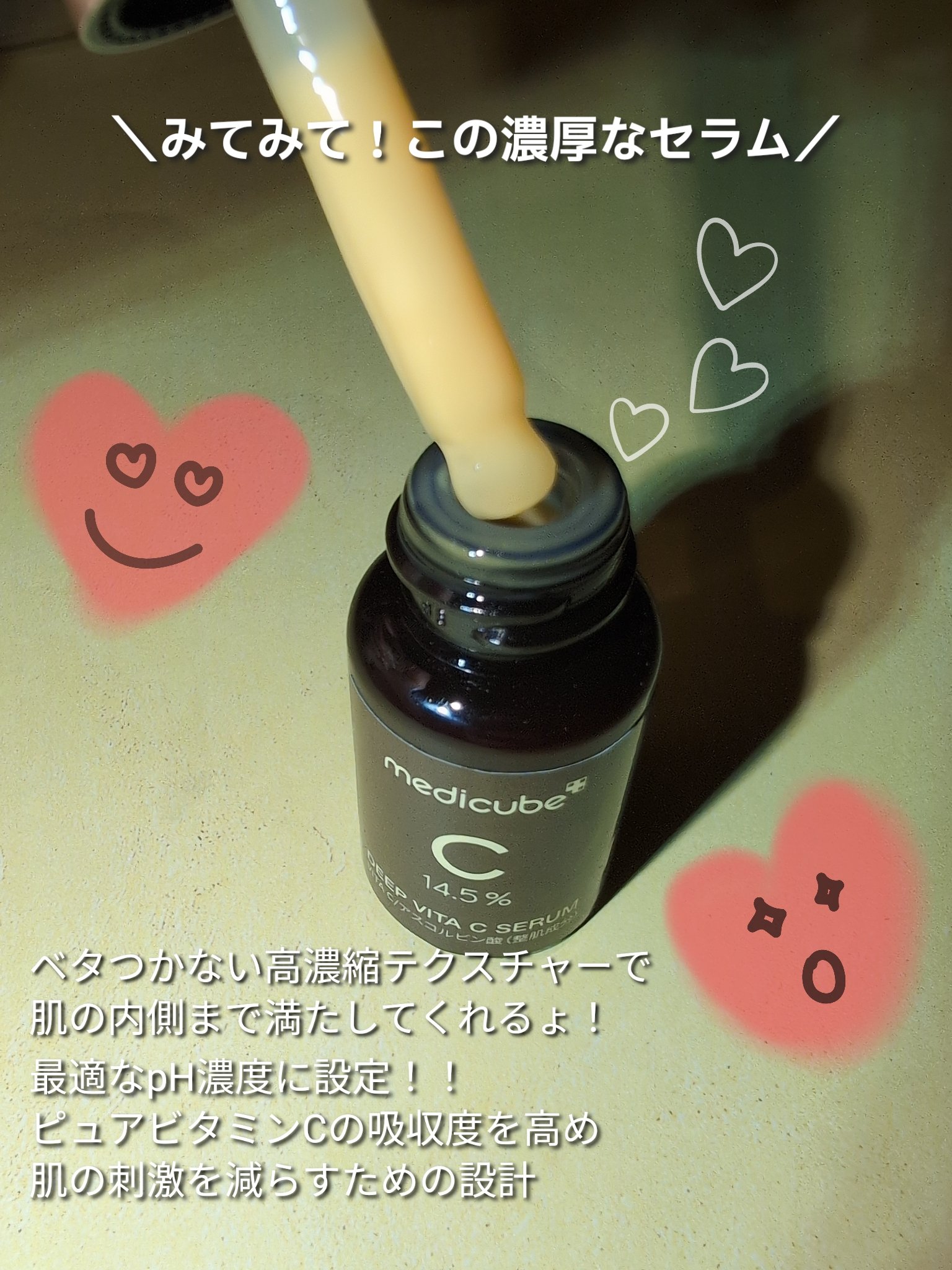 韓国🇰🇷ダーマコスメブランドの[medicube(メディキューブ)]のシミ消しケア。累計100万個販売突破の人気のアイテム! 7日間で肌がトーンアップすることが臨床試験で確認され、美白としわ改善もケアできる美容液✨ とにかく濃い! トロッと濃厚なのがわかります 高濃度ビタミンの証、独特の香りがします