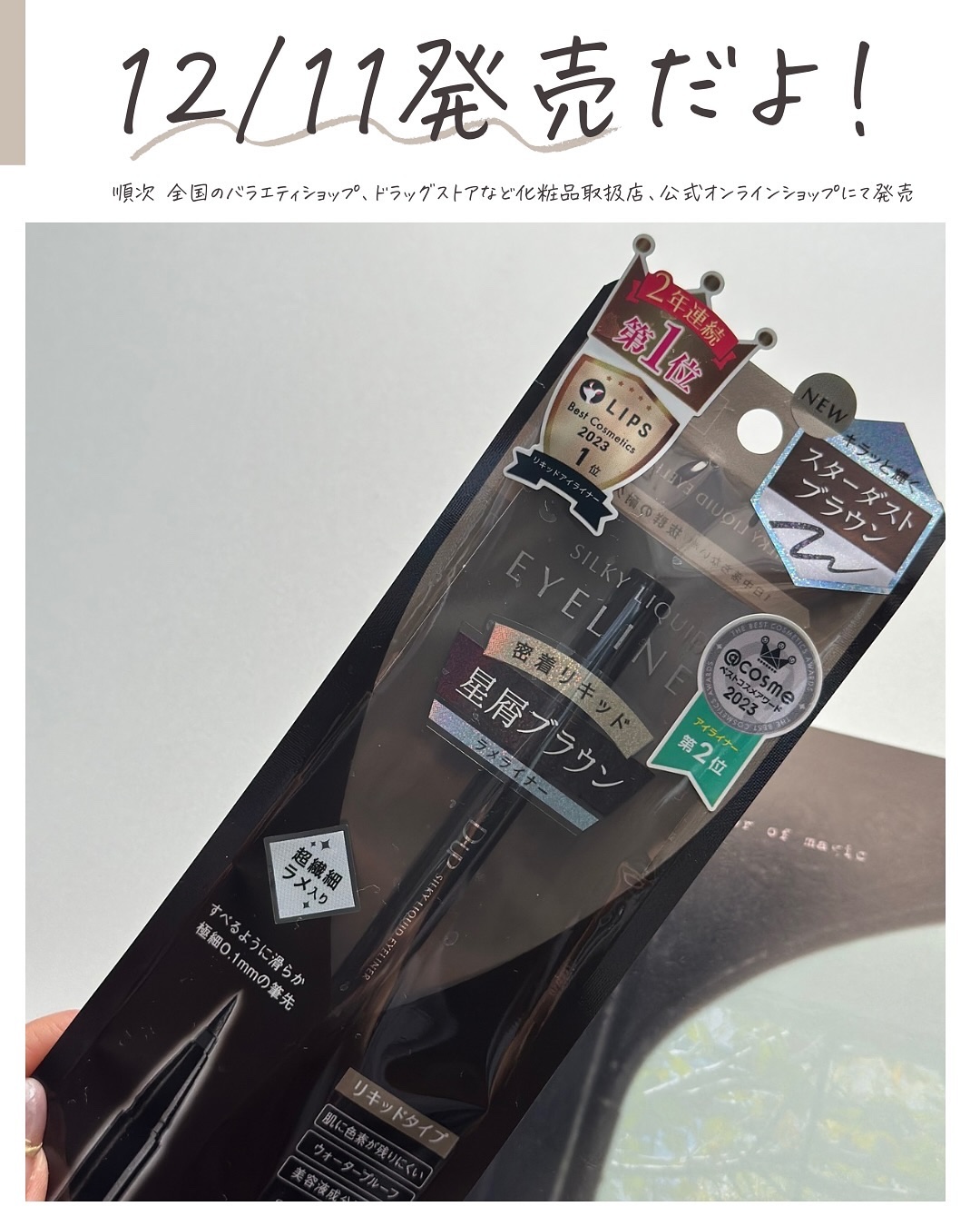 - 筆先までずっとなめらか、目尻で感動するリキッドアイライナー。 必要な量が肌にのる新設計で、まぶたの上をすべるような、滑らかな描き心地。しなやかでコシのある筆が、筆圧のコントロールを容易にし、太いラインも細いラインも思い通りに仕上げます。水、汗、涙に強いウォータープルーフタイプなのに、通常洗顔で簡単オフ。肌に色素が残らない顔料を使用。5種類の美容液成分を従来品の200%配合し、メイクしながら目元ケアまで。 ●ブラウンブラック ※2020年9月12日 バラエティショップ先行発売 ●漆黒ブラック ※2020年12月頃発売予定 ●ナチュラルブラウン ※2020年12月頃発売予定 ●シフォンブラウン 「毎日メイクに透明感と抜け感」 ブラウンでも、グレーでも、ベージュでもないニュアンスカラー。 自然な印影で素の目元を際立て、頑張りすぎない、ふんわりとした目元に。 ●アプリコットブラウン 「じゅわっと血色感。 肌に馴染むおしゃれカラー」 温かみのあるアプリコットがじゅわっと滲む血色感を目元に演出。 肌馴染みが良いので、カラーライナーに抵抗がある方もブラウンの延長線上で楽しめる、使いやすい色味です。 ”ちょっとオシャレ”な空気感を演出するカラー。 ●ピンクショコラ アイライナー 「ピンクが溶け込む濃厚ブラウン」 肌馴染みが良く、目元にじんわり血色感をプラス。 さりげなく女性らしさが加速するようなカラー。 ●ピスタチオラテ (2022年7月29日(金)発売) 「“目尻”に抜け感アクセント」 肌に馴染むのに映える絶妙なグリーン。 トレンドカラーに“くすみ”と“抜け感”をプラスしたまろやかな発色。 ●マスタードブラウン 「“イエロー”が揺れる、大人の洒落色」 (2022年7月29日(金)発売) まるで太陽のような暖かさを感じる新しいブラウン。 ほんのり感じるイエローでメイクが一気に垢抜ける稀有な色。 ●シフォンピンク(2023年2月10日発売) 「ふんわり柔らか"まろみピンク"」 甘くなりすぎない青みニュアンスで目元の透明感UP。 目元を引き締め、ピンクメイクにありがちな腫れぼったさを解消。 ●ミルクカプチーノ(2023年4月21日発売) まろやかな深みの“優しい締め色” どんなメイクにも合わせやすいカラー。 自然な陰影でさりげなく目幅を拡張します。 ●グレーカシミア(2023年10月1日発売) ブラウンがほんのり溶け込んだ、暖色グレー まろやかな発色で、パーソナルカラーを問わず肌に馴染む 目元の陰影になりすまし、抜け感と目力を欲張りに叶える ●ダークフィグ(2024年6月1日発売) するする”なめらか。描きやすいのに、落ちにくい。 クッキリ可愛いほの甘ダークブラウン ●ピーチモカ(2024年8月1日発売) ふわっと自然に盛れる“桃色ブラウン” ほんのり血色感で目元にうるみ感を演出 ●スターダストブラウン(2024年12月11日発売) キラッと繊細に輝く''星屑ブラウン'' 透け感のあるダークブラウンの色味とラメの輝きが、目元に艶のある立体感を演出 ●チャコールモカ(2025年4月10日発売) 目元を締める''深みグレージュ'' 黄みや赤みに偏りすぎない絶妙な色設計で、自然に目元を強調