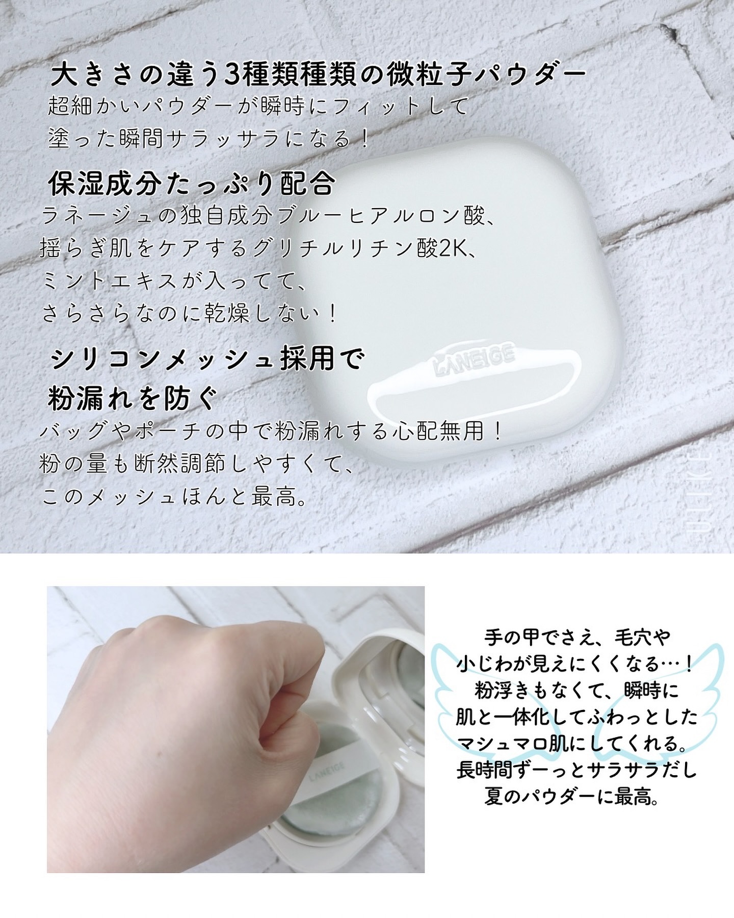 - 1.皮脂・毛穴・凹凸を瞬時にカバーする、3種の微粒子パウダー*¹を配合 粒子サイズの異なる3種の微粒子パウダー*¹が薄く均一に肌に密着し、皮脂・毛穴・肌の凹凸を瞬時にカバー。なめらかでマシュマロのようなやわらかな印象の肌へ。 ① 皮脂をコントロールするマイクロセバムコントロールパウダー(5umサイズ) 余分な皮脂だけを吸着し、肌の乾燥を防ぎ、さらっとした仕上がり ② 毛穴をナチュラルにカバー。ソフトフォーカス効果のあるポアブラーリングパウダー(10umサイズ) 気になる毛穴をナチュラルにぼかして時間が経っても毛穴落ちしないなめらかな肌をキープ ③ ふんわりした肌質感を演出するウルトラスムースパウダー(16umサイズ) ゴムボールのような弾性感を持つシリコンエラストマーパウダー*²が肌のキメに沿ってやさしく伸びながら凹凸をカバーし、なめらかでふんわりした肌を演出 2.保湿成分を豊富に配合。さらさらなのにしっとりうるおいが続く うるおい保持効果のあるラネージュの独自成分ブルーヒアルロン酸*³やゆらぎがちな肌をケアするグリチルリチン酸2K*⁴、ミントエキス*⁵など保湿成分を豊富に配合。皮脂を抑えるだけではなく、長時間しっとりうるおいが続きます。 3.シリコンメッシュで粉とび防止!いつでもどこでも持ち運べるポータブルタイプ アモーレパシフィック初の新素材シリコンメッシュを適用。切り込み模様や深さを最適化したことで適度な使用量の調整が可能となり、開封時や持ち運んでも粉とびしにくい設計を実現。持ち歩けるコンパクトタイプなのでいつでもどこでも簡単にメイク直しを叶えます。パッケージはネオクッションと互換性があり、組み替えてご使用いただくことも可能です。 *¹ シリカ、(ジメチコン/ビニルジメチコン)クロスポリマー *² 2020 年 7月~2022年11月グローバル累計販売数量基準 *³ 加水分解ヒアルロン酸(保湿成分) *⁴ 整肌成分 *⁵ メンタアルベンシス葉エキス(整肌成分) 2024年 6月1日 Qoo10にて発売 ※4月20日より渋谷ロフト・銀座ロフトにてオフライン先行発売(数量限定につきなくなり次第終了) ※5月28日より楽天にてオンライン先行発売 ※6月1日以降、全国のバラエティショップ・ドラッグストアにて順次発売予定