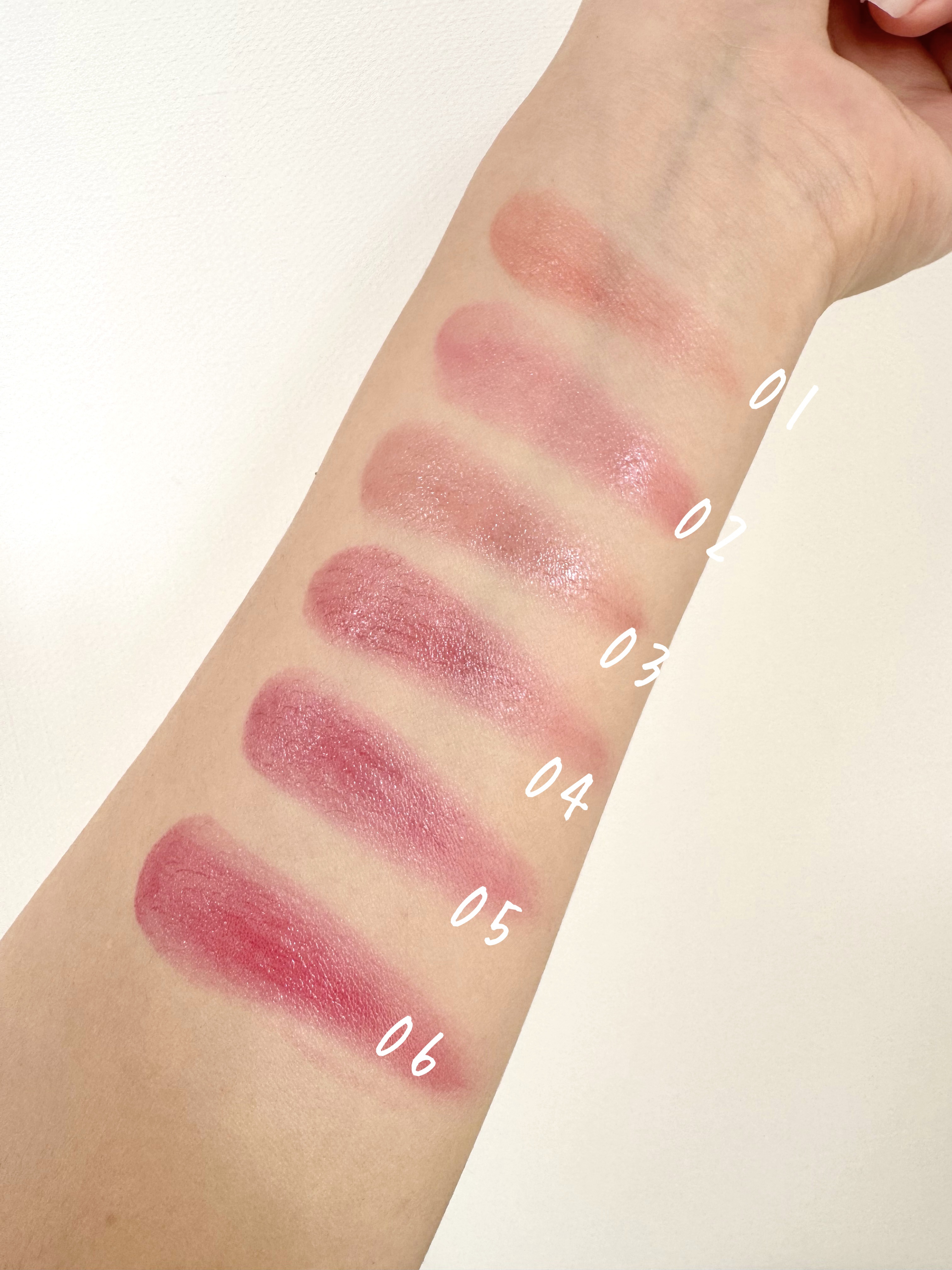 - ヘルシーで華やかな印象を叶える、リップやチークなどマルチに使える透明感のあるカラーのバーム。 <01 ピーチフラッシュ(PEACH FLUSH)> ヘルシーに表現されるピーチ コーラル カラー <02 バニーブラッシュ(BUNNY BLUSH)> 可愛らしく清純なベビーピンク カラー <03 ロージーブロー(ROSY BLOW)> 落ち着きのある成熟したロージーカラー <04 フロムベリー(FROW BERRY)> 紫色を一滴追加、デイリーベリーカラー <05 チェリーシャワー(CHERRY SHOWER)> イキイキとした血色感を与えるチェリー 果汁カラー <06 アップルガーデン(APPLE GARDEN)> クリアに満ちるレッドアップルカラー <07 アプリコット ブリーズ(APRICOT BREEZE)> やわらかい陽ざしのぬくもりを閉じ込めたサンキスドコーラル <08 バブリープラム(BUBLY PLUM)> 活気に満ちたライラックの花のように爽やかなライブリーパープル <100 シュガーリボン(SUGAR RIBBON)> ふんわり甘く、きゅんをひとさじしたようなローズピンクカラー