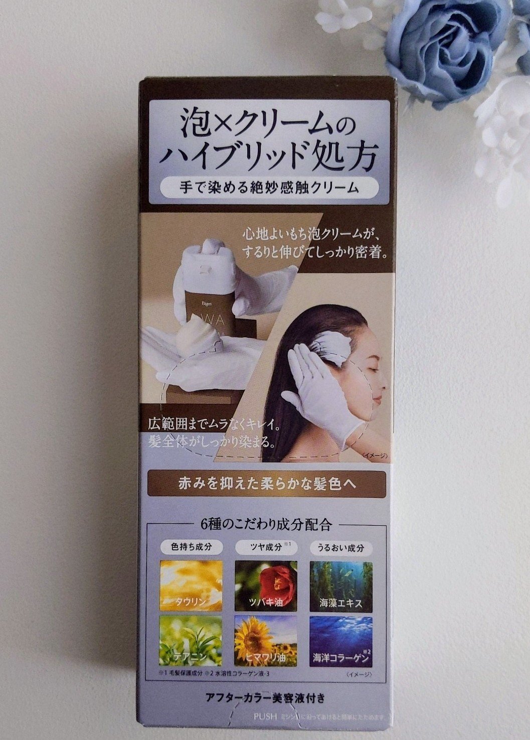 クリームと泡の良いとこどり白髪染め!もっちりなめらかな泡クリームで白髪の気になる生え際からしっかり密着し髪全体にも塗りやすかったです。 艶やかな髪色へと導くタウリン、ツバキ油、海藻エキスなど厳選成分を配合。きつい香りが少なく、ワンプッシュで混ぜる手間いらず、次回にとっておけるパッケージもありがたい♪ アフターカラー美容液付きでごわつき感のない仕上がり!