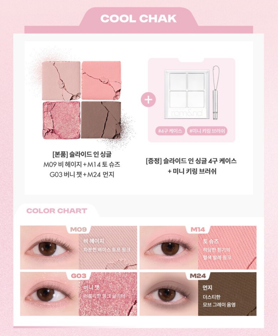 - シングルで自分好みに! スライド式シャドウ 多彩なカラーから選ぶ楽しさや、集めるワクワク感を味わえる 【シングルシャドウ】が今大人気! そんなシングルシャドウ界に、毎回トレンディな商品を生み出す、rom&ndが君臨します。 スライドするだけで、簡単にオープン! サッとスライドして、サッと瞼を華やかに彩ってください。 絶妙な色展開で、どんなメイクも自由自在に演出できます。 普段パレットで底見えしてしまう色味だけをピックして、自分だけの組み合わせを楽しんでください。 密度の高いテクスチャーで目元にしっかり密着 【マット】・【シマー】・【グリッター】 異なる3つのテクスチャーで、どのテクスチャータイプも高発色&高密着! さらに今回のスライドインシングルは、テクスチャーがグレードアップし、粉飛びせず、手で塗ってもきれいに仕上がります。 どのテクスチャータイプもアイシャドウだけでなく、ハイライトやチークとしてマルチに活躍する万能アイテムです!