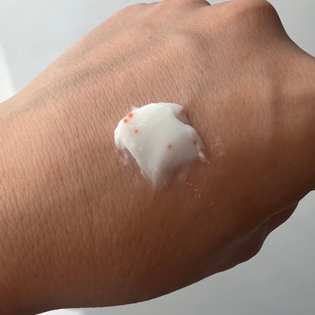 救世主の高保湿クリーム🤗 乳白色の柔らかめクリーム オレンジのプチプチが入ってて、これがビタミンオイルカプセル※2 オイルが体温でトロっと溶けてオレンジ色のカプセルが自然に一体化🤲