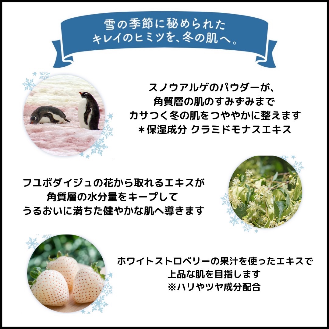 - 数量限定発売 寒い冬も凛ときらめく雪の結晶のようなつやめき美肌へ導く、フェイスマスクです。 乾燥が厳しい冬の肌をスノウアルゲパウダー*1がしっかりと保湿。 さらに、ホワイトストロベリーエキス*2やビタミンE*3が雪のように輝く上品なツヤを届けます。 うっとり甘いホワイトバニラの香りです。 (*1 保湿成分 クラミドモナスエキス *2 ハリ・ツヤ成分 フラガリアチロエンシス果汁 *3 リ・ツヤ成分 トコフェロール)