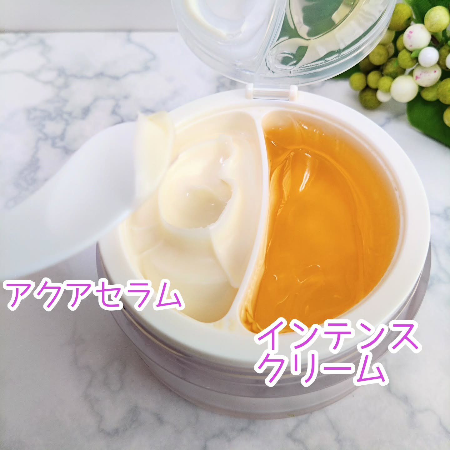 アクアセラムは、ヒアルロン酸、パンテノール、ツボクサエキスが含まれた、さっぱりとした使用感で肌に水分を与え肌のキメを整えます。 インテンスクリームは、イタリア産ホワイトトリュフが含まれた、もっちりした使用感で肌にうるおいを与えツヤのあるもち肌へ導きます。 パカッと開く内蓋が付いていて、蓋の裏にクリームが付かない仕様になってるのが嬉しい!