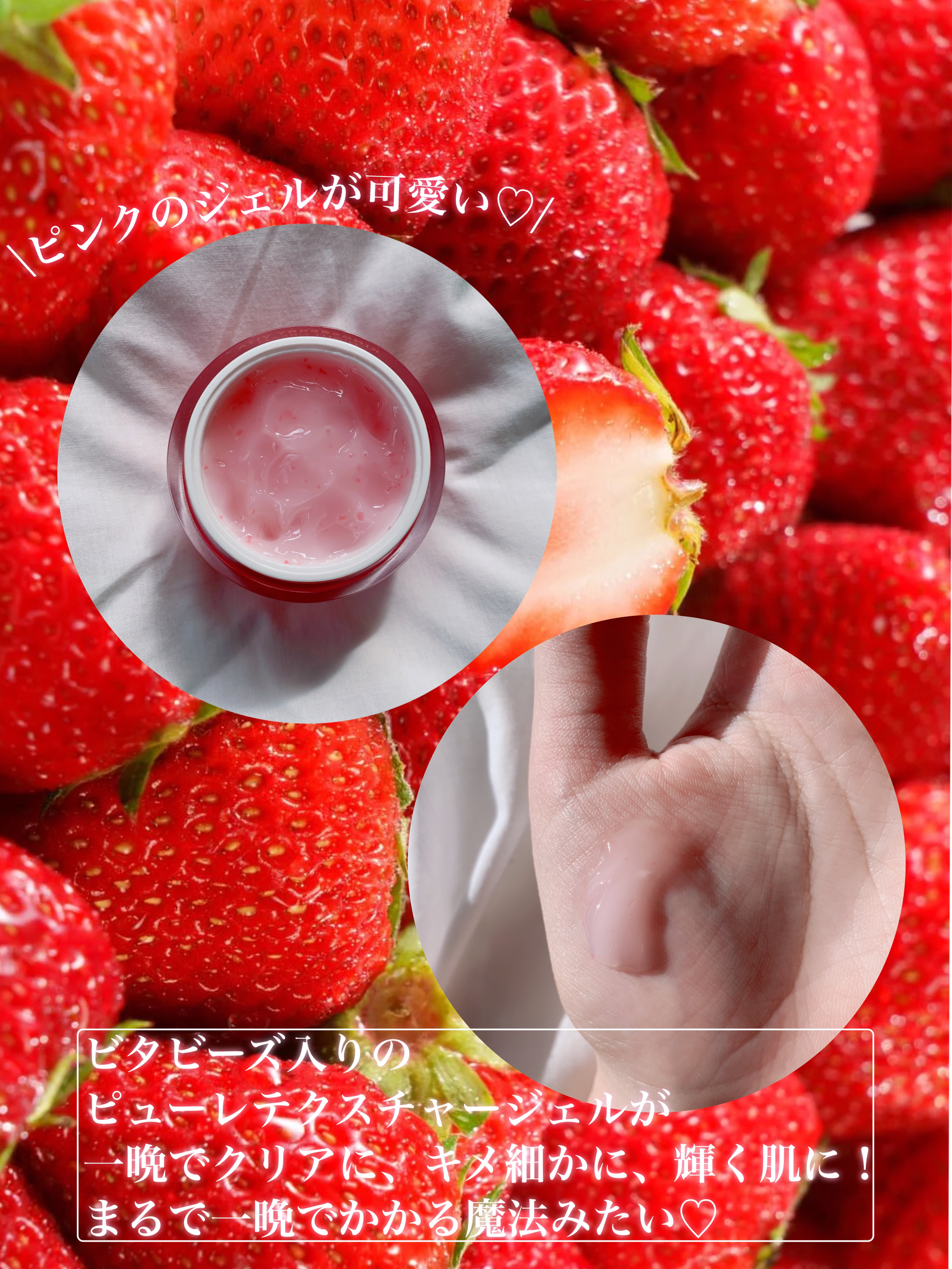 キングスベリーは一般的ないちごの2倍の大きさで、抗酸化成分とビタミンが豊富! メイクノリUPレシピで肌のトーン、キメ、ツヤにアプローチしてくれるそうです。 プルンとしたジェル状のクリームはなめらかなテクスチャで伸びもよし。