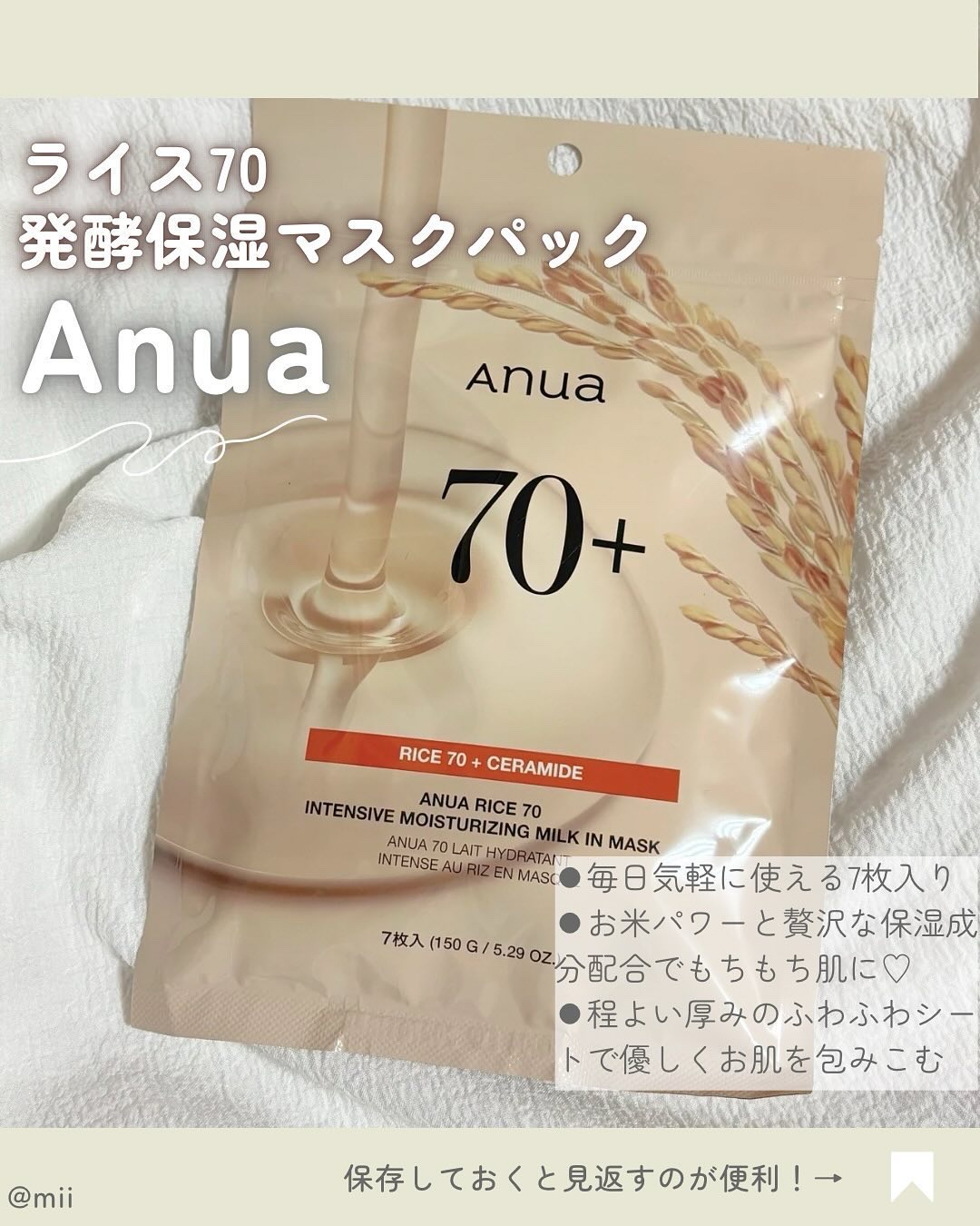 Anuaのライス70発酵保湿マスクパック 7枚入り米ぬかエキスを贅沢に配合。お肌をなめらかに整え、つやとハリ弾力ケア。シートは程よい厚みで、しっかり密着。ほぼ無香料で自然な使い心地。乳液のマスクなので、化粧水や美容液を使ったあとに保湿の役割と...