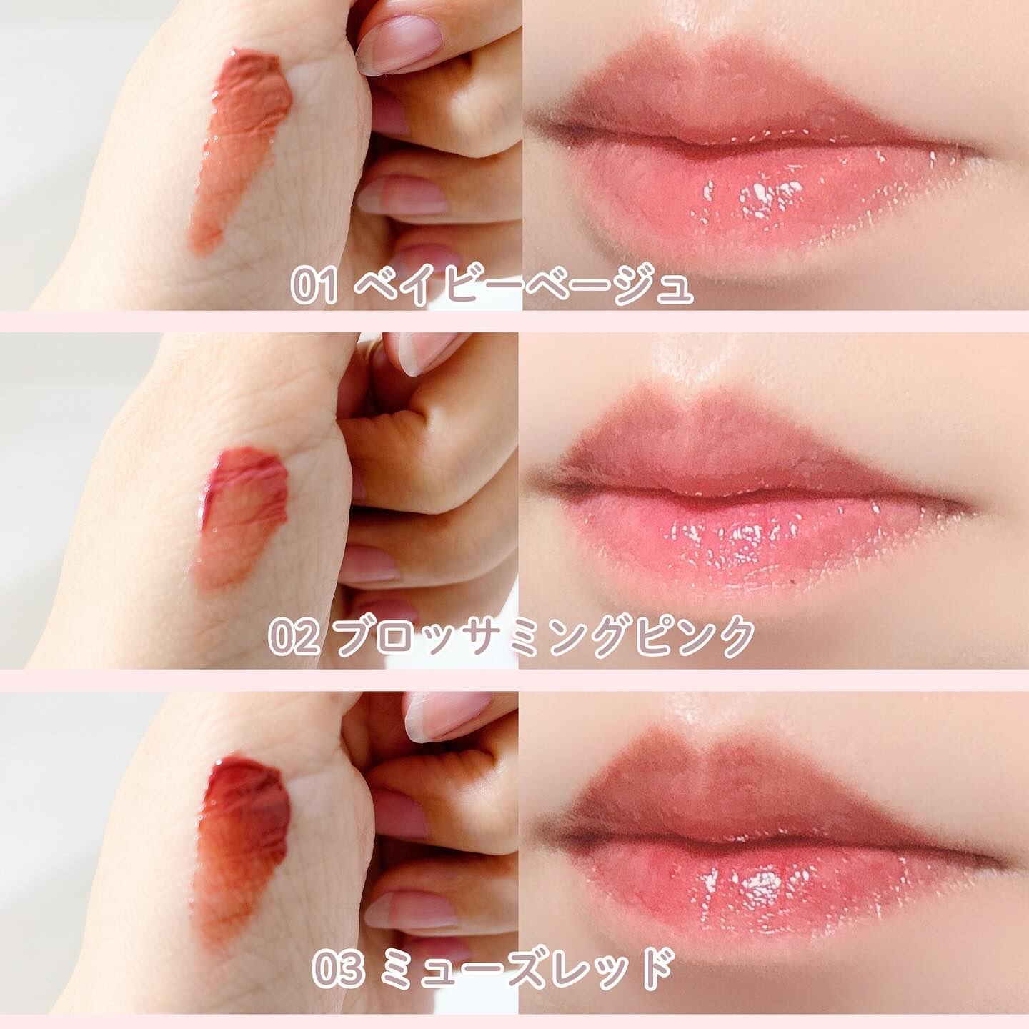 - <ベイビーベージュ> 水、リンゴ酸ジイソステアリル、ビスジグリセリルポリアシルアジペート-2、ジフェニルジメチコン、水添ポリイソブテン、トリメチルシロキシフェニルジメチコン、ポリフェニルシルセスキオキサン、グリセリン、セチルPEG/PPG-10/1ジメチコン、ポリソルベート60、イソステアリン酸ソルビタン、セテアレス-20、1,2-ヘキサンジオール、(アクリル酸ヒドロキシエチル/アクリロイルジメチルタウリンNa)コポリマー、酸化チタン、スクワラン、フェノキシエタノール、メントキシプロパンジオール、エチルヘキシルグリセリン、黄5、赤227、黄4、水酸化Al、ポリアクリル酸アンモニウム、BG、青1、テトラ(ジ-t-ブチルヒドロキシヒドロケイヒ酸)ペンタエリスリチル <ブロッサミングピンク> 水、リンゴ酸ジイソステアリル、ビスジグリセリルポリアシルアジペート-2、ジフェニルジメチコン、水添ポリイソブテン、トリメチルシロキシフェニルジメチコン、ポリフェニルシルセスキオキサン、グリセリン、セチルPEG/PPG-10/1ジメチコン、ポリソルベート60、イソステアリン酸ソルビタン、セテアレス-20、1,2-ヘキサンジオール、(アクリル酸ヒドロキシエチル/アクリロイルジメチルタウリンNa)コポリマー、スクワラン、フェノキシエタノール、メントキシプロパンジオール、酸化チタン、エチルヘキシルグリセリン、黄5、赤227、水酸化Al、黄4、ポリアクリル酸アンモニウム、青1、BG、テトラ(ジ-t-ブチルヒドロキシヒドロケイヒ酸)ペンタエリスリチル <ミューズレッド> 水、リンゴ酸ジイソステアリル、ビスジグリセリルポリアシルアジペート-2、ジフェニルジメチコン、水添ポリイソブテン、トリメチルシロキシフェニルジメチコン、ポリフェニルシルセスキオキサン、グリセリン、セチルPEG/PPG-10/1ジメチコン、ポリソルベート60、イソステアリン酸ソルビタン、セテアレス-20、1,2-ヘキサンジオール、(アクリル酸ヒドロキシエチル/アクリロイルジメチルタウリンNa)コポリマー、スクワラン、フェノキシエタノール、メントキシプロパンジオール、酸化鉄、酸化チタン、エチルヘキシルグリセリン、赤227、黄4、黄5、ポリアクリル酸アンモニウム、水酸化Al、青1、BG、テトラ(ジ-t-ブチルヒドロキシヒドロケイヒ酸)ペンタエリスリチル