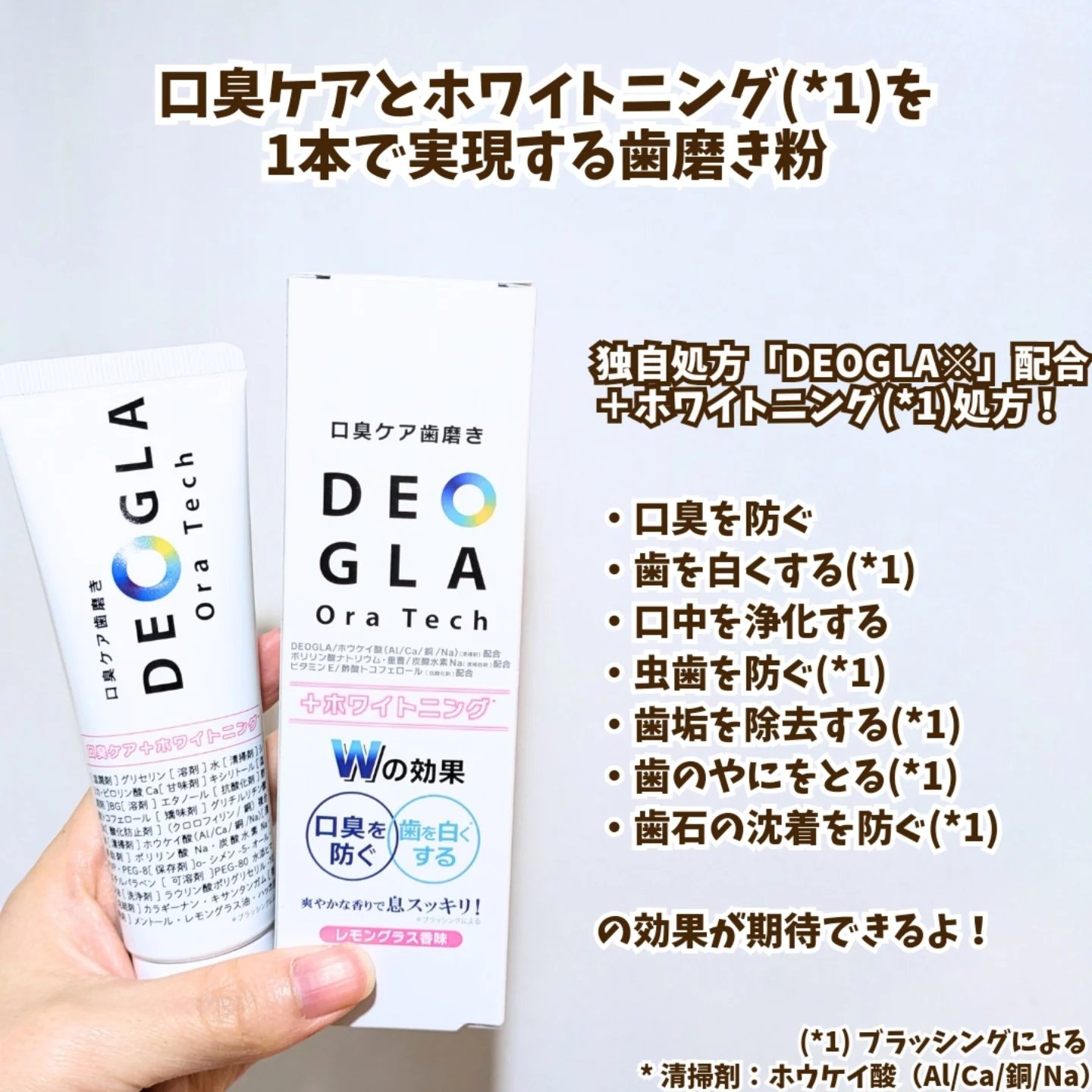 - \独自成分「DEOGLA®︎」(清掃剤)配合/ 創業200年を超える素材メーカーがつくる口臭ケアに特化した歯磨き粉! 製品の特長: 多数のご要望をいただいていた、口臭とホワイトニング *を1本でケアいただけます。ホワイトニング *はもちろん、独自成分DEOGLA配合で口臭にアプローチ。 徹底的にこだわった成分を配合しているので、口臭ケアとしてだけでなくお口のトータルケアにご活用ください。 ミントが苦手な方にもおすすめな、レモングラス香味、控え目な泡立ちでしっかりとブラッシングしていただけます。 ▶独自成分DEOGLA : 化粧品成分名称 ホウケイ酸(Al/Ca/銅/Na) *ブラッシングによる