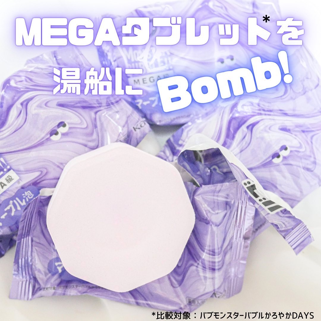 - 【医薬部外品】 この発散*1入浴、きっとクセになる。 外の現実から離れて、どっぷりオフロを楽しもう! とろけてゆらめくマーブル泡。 ●MEGAタブレット*2 ●炭酸量MAX*3 ●温浴効果を高め、疲労回復 ●ラベンダーカクテルの香り *1炭酸泡がはじけること *2比較対象:当社バブモンスターバブルかろやかDAYS *3モンスターバブルMEGA級シリーズとして、バブ製品内で炭酸量が最大 湯の色:スペースバイオレット(色つき透明) ラベンダーカクテルの香り