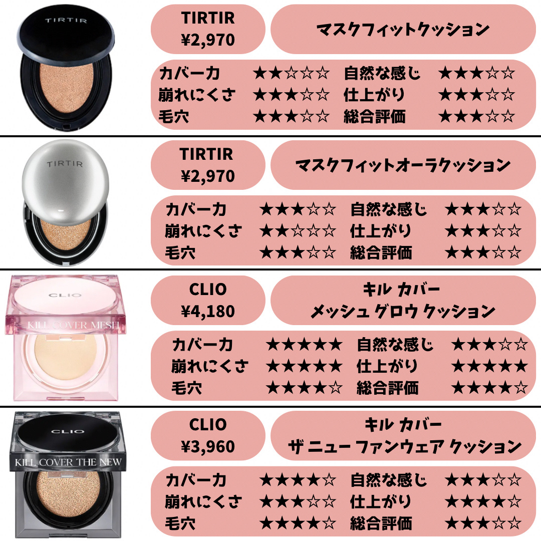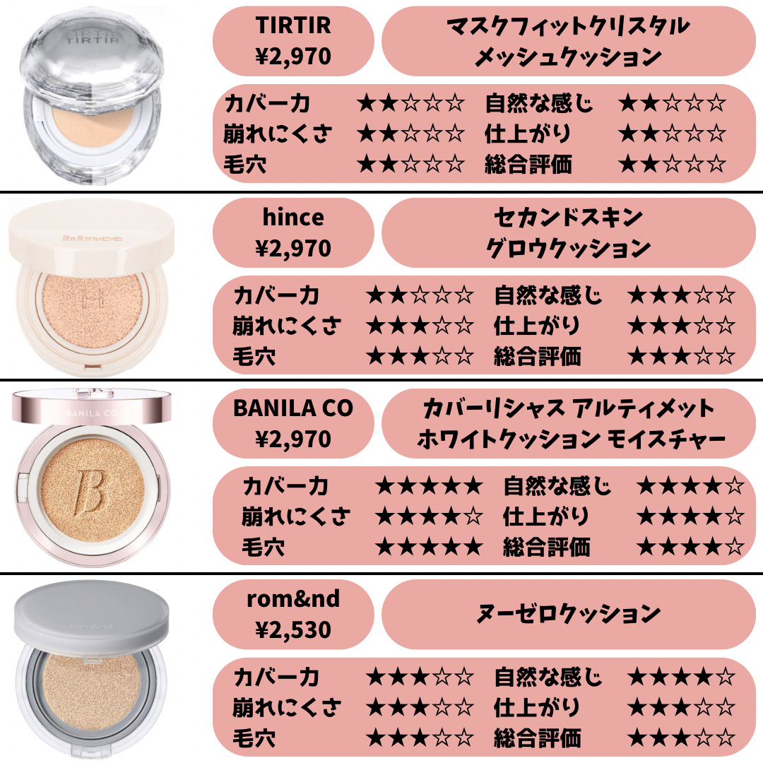 今まで使ったクッションファンデ正直大量レビュー!乾燥寄り混合肌、標準色より少し明るめです。✦・・✦MISSHAMクッションファンデーションモイスチャーNo.21✦・・✦&be&beクッションファンデーションライトベージュ✦・・✦TIRTIRマ...