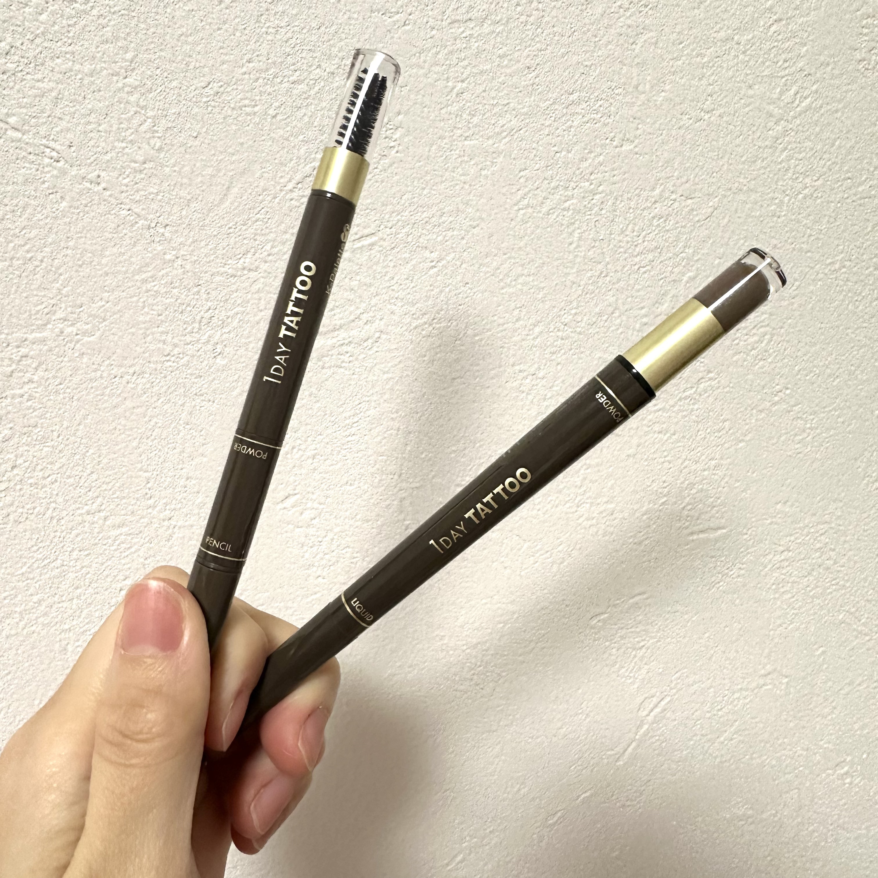 K-パレット1DAY TATTOシリーズのアイブロウが機能面をさらにパワーアップしてリニューアル登場! 極上筆やなめらか芯で、どんな眉でも簡単!的確に描けて自然な仕上がりに。 くすみ感のある洒落感カラーは肌なじみの良さ抜群で、ぼかしが甘くても自然に溶け込むような絶妙発色 リキッドはパウダーと比べると発色淡めで薄付きに感じましたが、シュッと線で描けるので自眉のように毛並みをしっかり作れます。