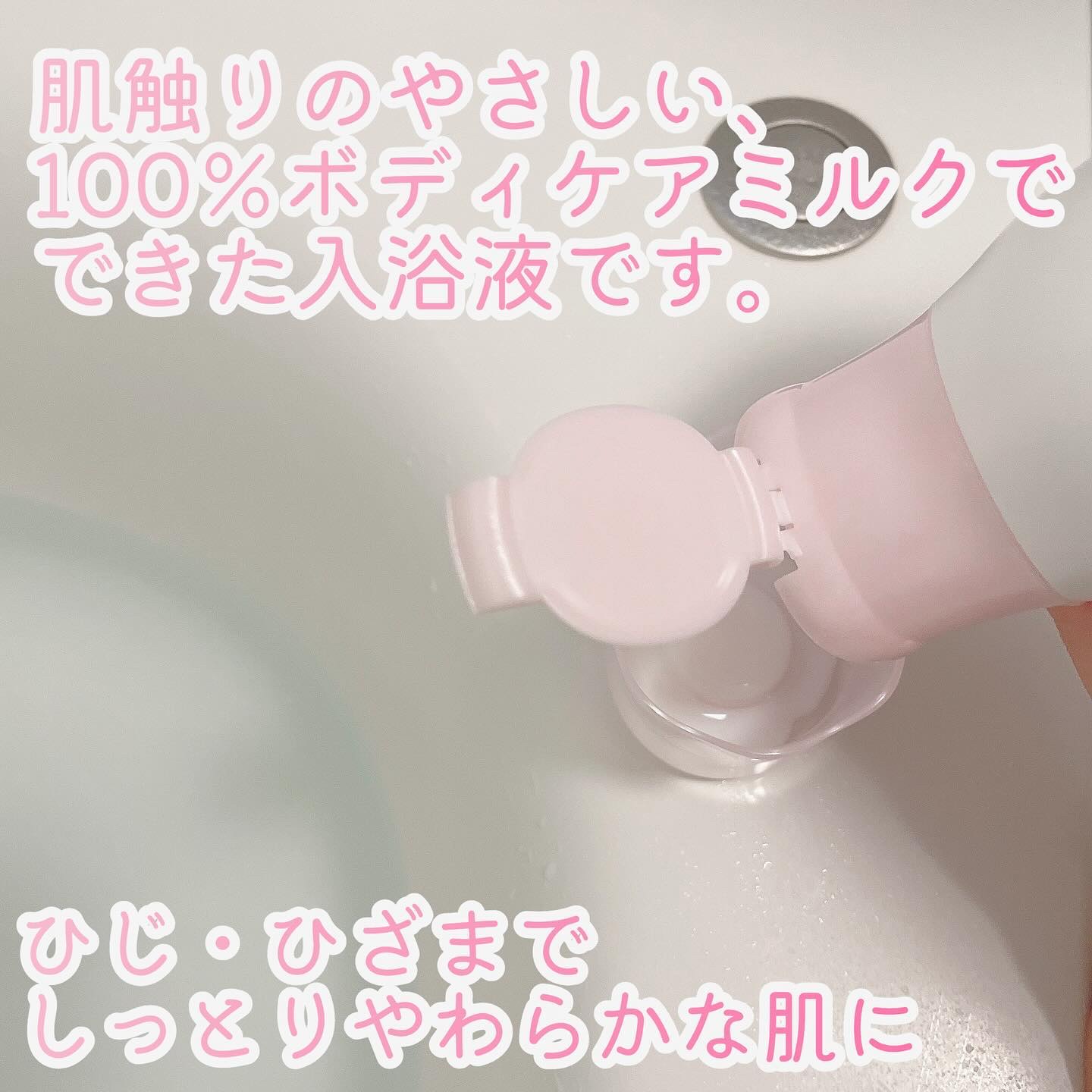 角層まで浸透するうるおいバスミルク(保湿入浴液)ほのかでパウダリーな香りを使用してみました。 お風呂のお湯に入れるアイテム。お湯に約40ml(キャップの入れ目線一杯)の割合で入れ、よくかき混ぜて入浴します。 100%ボディケアミルクでできた入浴液なので、このままお風呂から上がって身体を拭いています。