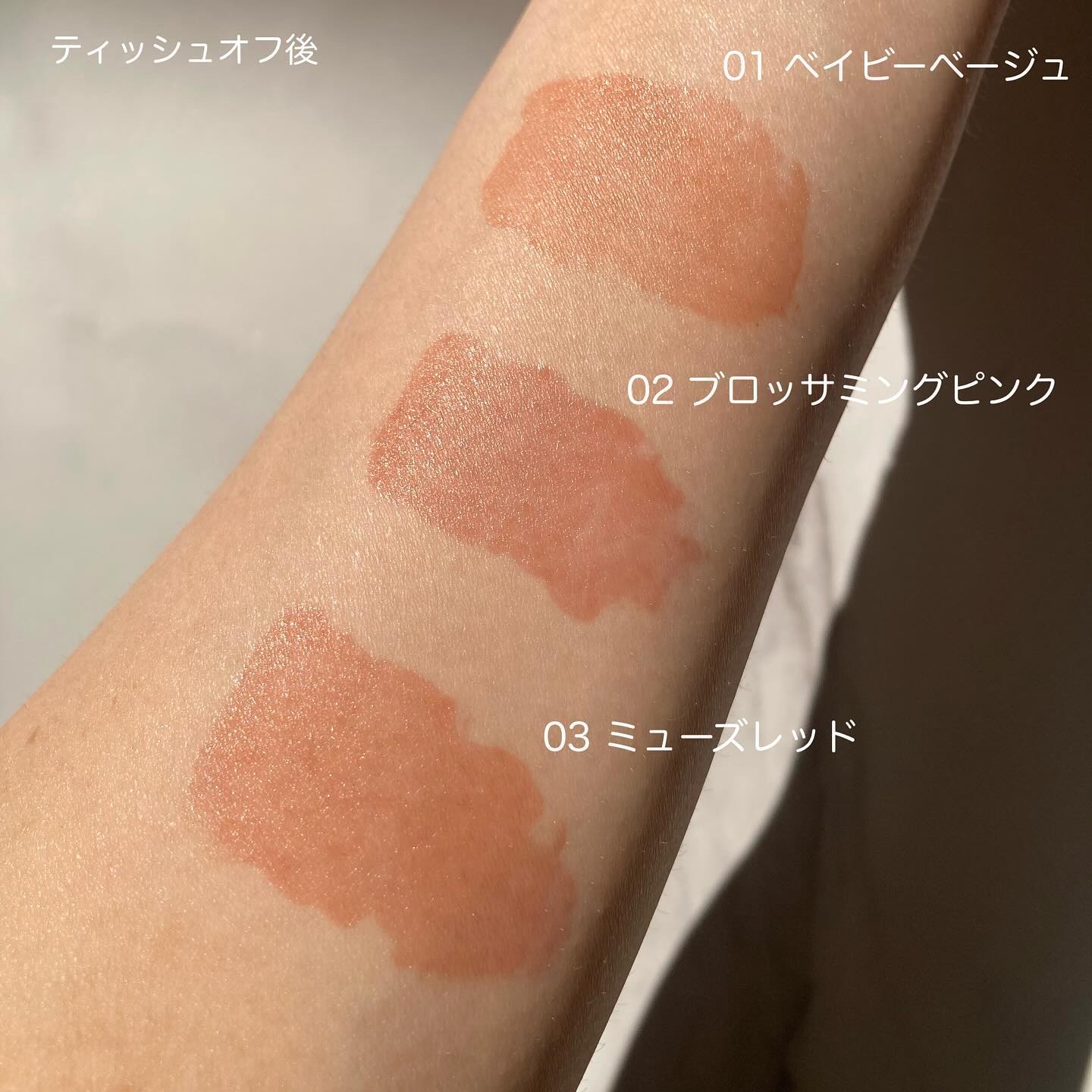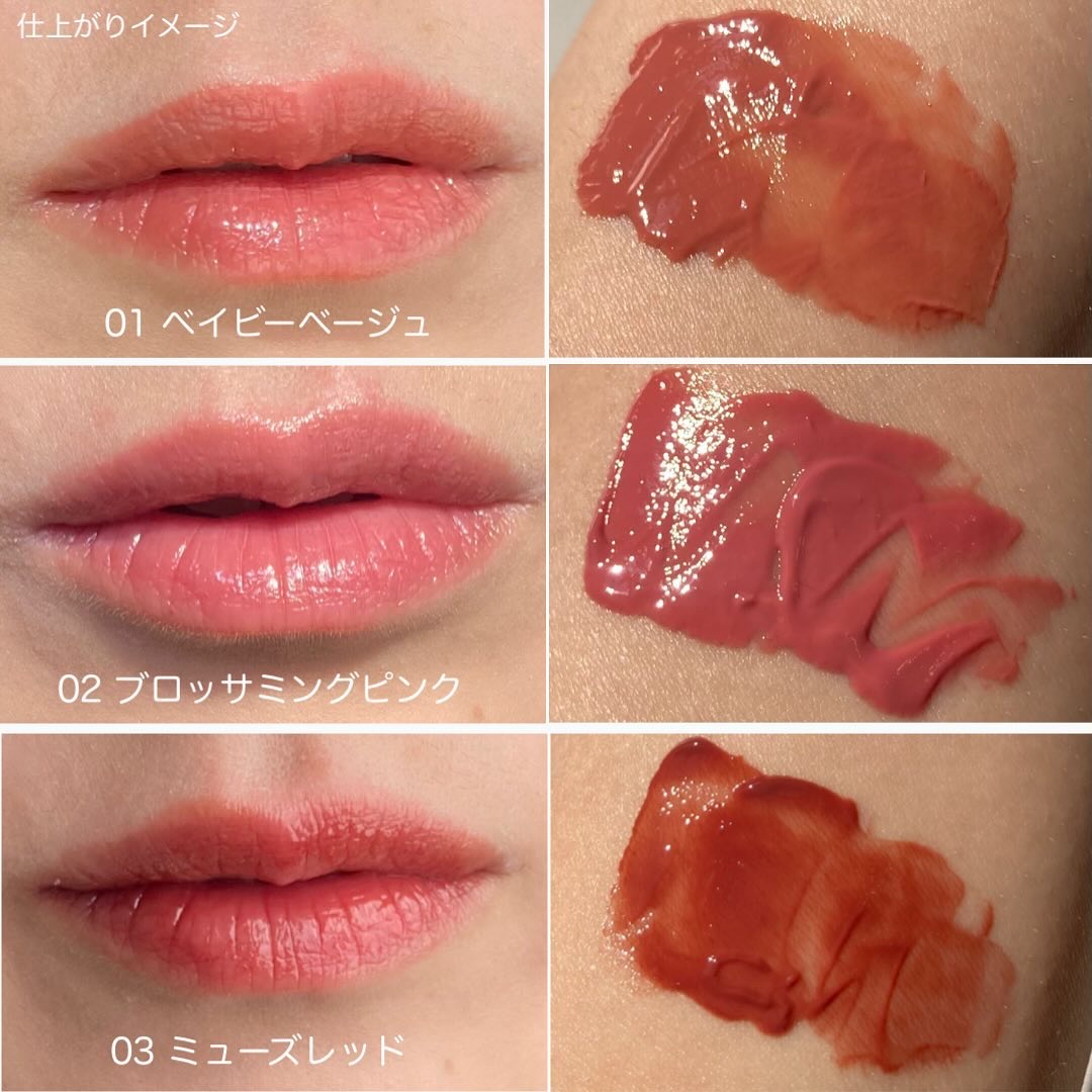 ニュートラルなベージュ系粘膜風カラー ▣01 ベイビーベージュ ▣02 ブロッサミングピンク ▣03 ミューズレッド 塗ったあとにツヤオイル膜が浮き上がって ぷるちゅるな唇に♡ ほんのりスーッとした付け心地です·͜· * 数量限定なので見かけた方はぜひ( ॑˘ ॑* )✧*。