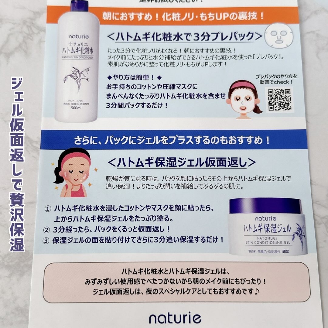 ハトムギ化粧水で3分プレパック ✔︎︎︎︎ 朝におすすめ ・コットンや圧縮マスクにまんべんなくたっぷりハトムギ化粧水を含ませ約3分間パックするだけ、化粧ノリ⤴︎に期待♩ ハトムギ保湿ジェル仮面返し ✔︎︎︎︎ なんだかいつものお手入れじゃ物足りない時に ・ハトムギ化粧水を浸したコットンやマスクを顔に貼った上からハトムギ保湿ジェルをたっぷり塗り約3分経ったらパックをくるっと仮面返し! 手軽なのにワンランク上の自分を目指せそうじゃない? 早速試してみてね✨️