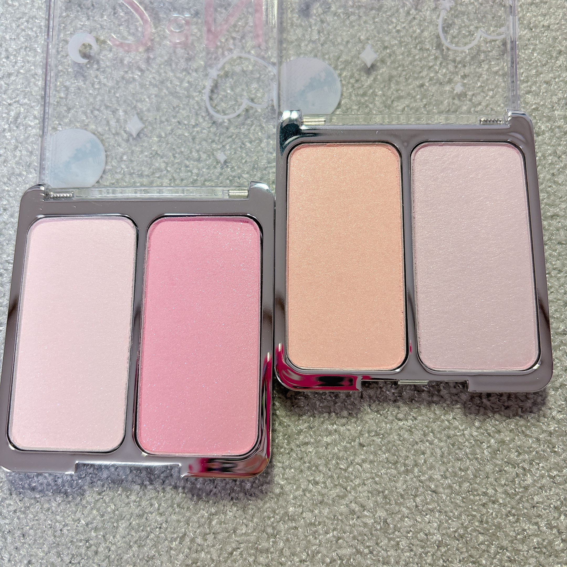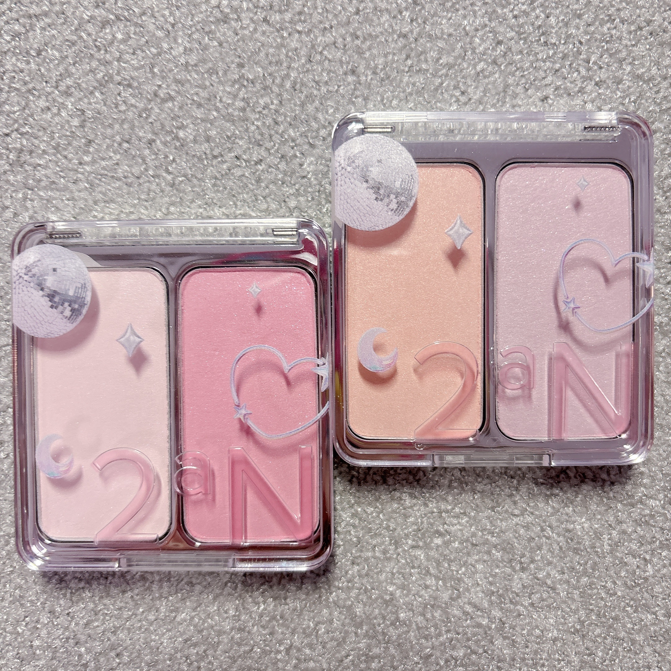 6色のアイシャドウパレット1種とミックスして使えるデュアルチーク2種、多彩なグリッターのハイライター2種💖 アイシャドウのラメはまるで星屑を散りばめたような煌めき˚✧₊ ハイライター、チークは透明感増して可愛い! ホリデーならではの煌めきがとても綺麗です🥹✨