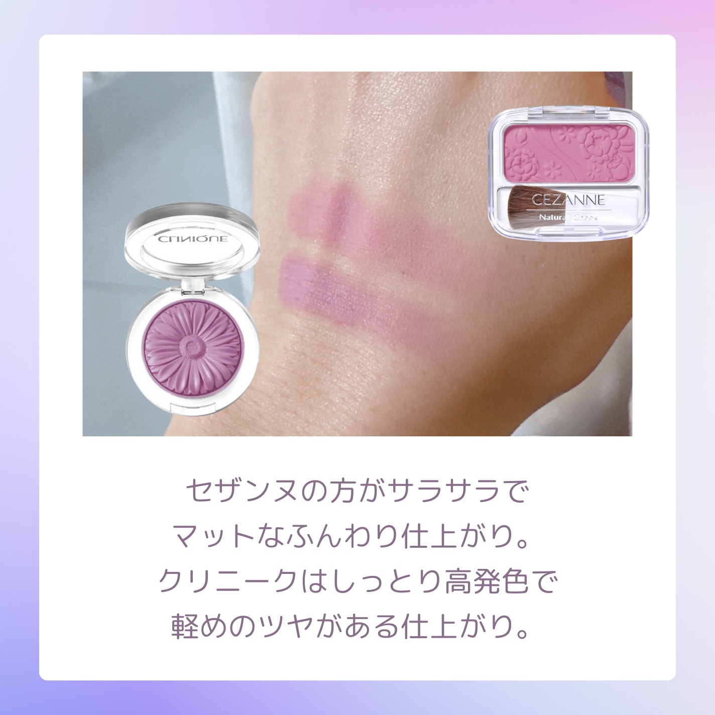 紫チークといえばCLINIQUEのパンジー ポップ🪻 めちゃくちゃ有名で知ってる人も多いんじゃないかな...💭 肌に乗せると、青みがかったピンク色に8色する🩷 おかげで色白に見えます🫧 初心者の方でも使いやすいです☺︎ ぜひチェックしてみてね💫