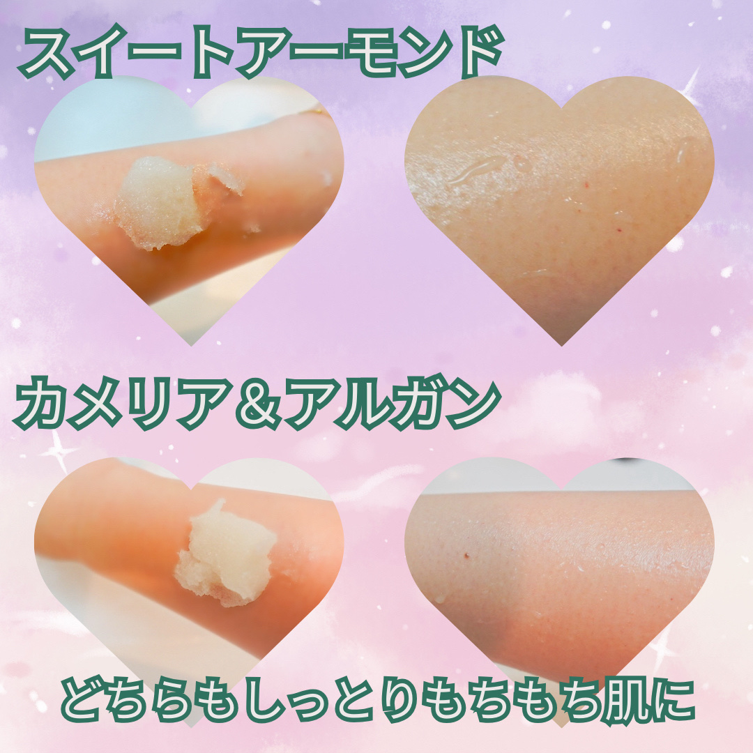 角質ケアと保湿ケアを同時に出来る! シュガーと植物オイルがたっぷりスクラブ✨ 天然植物オイルと砂糖から生まれたシュガースクラブ。古い角質を優しくオフし毛穴の汚れを落とすことで、うるおい成分が角層まで浸透し、くすみ知らずのボディ肌に…💕 やさしく華やかなスイートアーモンドフラワーの香り。やさしく華やかなバスタイムを楽しみたい方におすすめ!