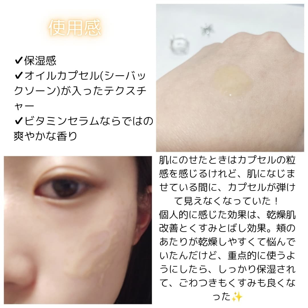 敏感で元気を失ったお肌にアプローチ オイルカプセルが弾けてシミケアにもぴったりなアンプル ビタコラーゲン+シーバックソーンオイルカプセルが二重保湿膜の形状で保湿してくれます とろりとしてるけど肌に馴染ませるとみずみずしいテクスチャー 柑橘系のさっぱりしたいい香り🍋