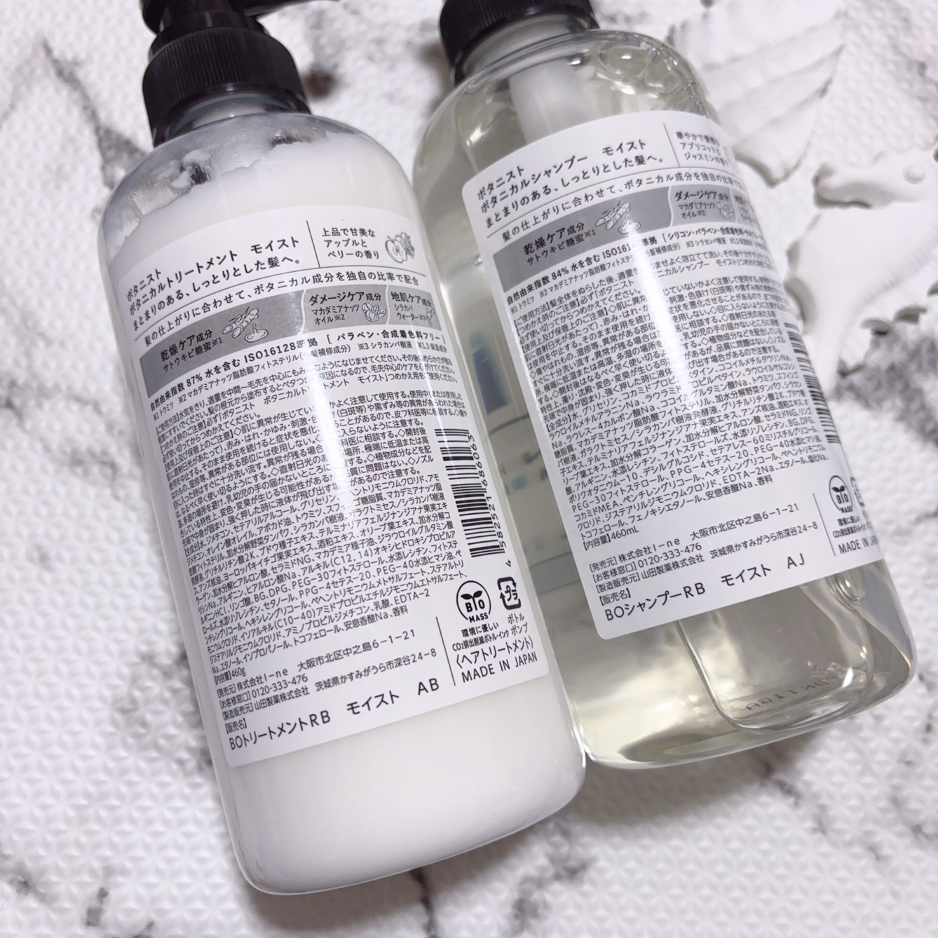- モイスト:まとまりのある、しっとりとした髪→アプリコットオイル*13 *13 アンズ核油(保湿成分) 1. 新配合成分を含む共通成分「新 濃密ボタニカル美容液***」で3つのケアを叶える <地肌ケア成分> スキンケアレベルで頭皮の潤いを保つことで、乾燥によるかゆみ・フケを抑えます。 ・北海道産 白樺発酵エキス*5【新配合】 白樺発酵エキスに含まれるガラクトミセス培養液が地肌に潤いを与えます。 ・北海道産 白樺樹液*6 ミネラル等の有用成分に富み、美容効果が高いことから 天然の化粧水と言われています。 <乾燥ケア成分> 毛髪内部と表面にアプローチし、キューティクルを接着することでうるおいをキープします。 ・香川県産サトウキビ由来の糖蜜*7【新配合】 髪に必要なアミノ酸、ミネラル、ビタミンと保湿成分の「糖」を含み、髪をコートすることで潤いある髪へ導きます。また、和三盆糖の製造過程で生まれる副産物を有効活用することで、サステナビリティにも貢献しています。 ・国産のお米由来のセラミド*8【新配合】 合成界面活性剤や有機溶剤を使用せずに、高純度のスフィンゴ糖脂質 (植物セラミド) を水にナノ化分散させた原料。髪内部に浸透して保湿し、潤いを与えます。 <ダメージケア成分> タンパク質・脂質由来の微細な植物成分がダメージ髪を補修します。 ・マカダミアナッツ由来のリペアセラム*9【新配合】 マカダミアナッツに含まれる脂肪酸をナノカプセル化、髪内部に浸透してキューティクルを密着補修。髪のダメージホール等を補修し、髪に必要な潤いを補うことで、しなやかで、潤いとツヤのある髪に導きます。 ・ボタニカルマイクロプロテイン*10 ケラチンよりも小さな粒子で、髪の内部に浸透する植物由来ケラチン類似物質。 なめらかでツヤやかな髪へ導きます。 *** シラカンバ樹液、ガラクトミセス/シラカンバ樹液発酵液、トウミツ、スフィンゴ糖脂質(全て保湿成分)、マカデミアナッツ脂肪酸フィトステリル、加水分解野菜タンパク(全て毛髪補修成分) *5 ガラクトミセス/シラカンバ樹液発酵液(保湿成分) *6 シラカンバ樹液(保湿成分) *7 トウミツ(保湿成分) *8 スフィンゴ糖脂質(保湿成分) *9 マカデミアナッツ脂肪酸フィトステリル(毛髪補修成分) *10 加水分解野菜タンパク(毛髪補修成分) 2.髪の構成要素へ着目し、必要なものを必要なだけいたわりながら補う 髪に必要な「水分・脂質・タンパク質」由来の植物成分を髪の内側まで浸透させ、髪を根本からケアし、潤いに満ちたしなやかな髪に仕上げます。 ▶︎水分 :北海道産の白樺発酵エキス*5×白樺樹液*6、香川県産サトウキビ由来の糖蜜*7、国産お米由来のナノセラミド*8 ▶脂質 :マカダミアナッツオイル由来のナノリペアセラム*9 ▶タンパク質 :ボタニカルマイクロプロテイン*10 *5 ガラクトミセス/シラカンバ樹液発酵液(保湿成分) *6 シラカンバ樹液(保湿成分) *7 トウミツ(保湿成分) *8 スフィンゴ糖脂質(保湿成分) *9 マカデミアナッツ脂肪酸フィトステリル(毛髪補修成分) *10 加水分解野菜タンパク(毛髪補修成分) 3.なりたい仕上がりに合わせて「新 濃密ボタニカル美容液***」を独自比率で配合 髪・頭皮の状態に合わせ濃密ボタニカル美容液***の配合比率を変えることで、理想的な仕上がりを目指すことができます。また、シリーズごとに厳選された植物由来成分を配合しています。 *** スフィンゴ糖脂質(保湿成分)、マカデミアナッツ脂肪酸フィトステリル(毛髪補修成分)、 シラカンバ樹液(保湿成分)、ガラクトミセス/シラカンバ樹液発酵液(保湿成分)、トウミツ(保湿成分)、加水分解野菜タンパク(毛髪補修成分) 4.香り彩る、ダブルフレグランス ケアのステップに合わせて広がりが生まれるよう、同じシリーズでもシャンプーとトリートメントで異なる香りを採用。セットで使うことで、BOTANIST独自の香りの世界は一層魅力を増します。 モイスト:シャンプー: 華やかで優雅なアプリコットとジャスミンの香り トリートメント:上品で甘美なアップルとベリーの香り 5.環境に配慮したパッケージと原料へアップデート、よりサステナブルなブランドへ 【パッケージの環境対応】 従来品から引き続き、ボトルには再生可能な有機資源を原料とするバイオマスプラスチックを採用。 さらに、今回のフルリニューアルでは、容器ラベルのインクを環境負担の少ない植物由来のバイオマスインキ、アテンションシールを使用済みペットボトルから作られた再生PETに変更しました。