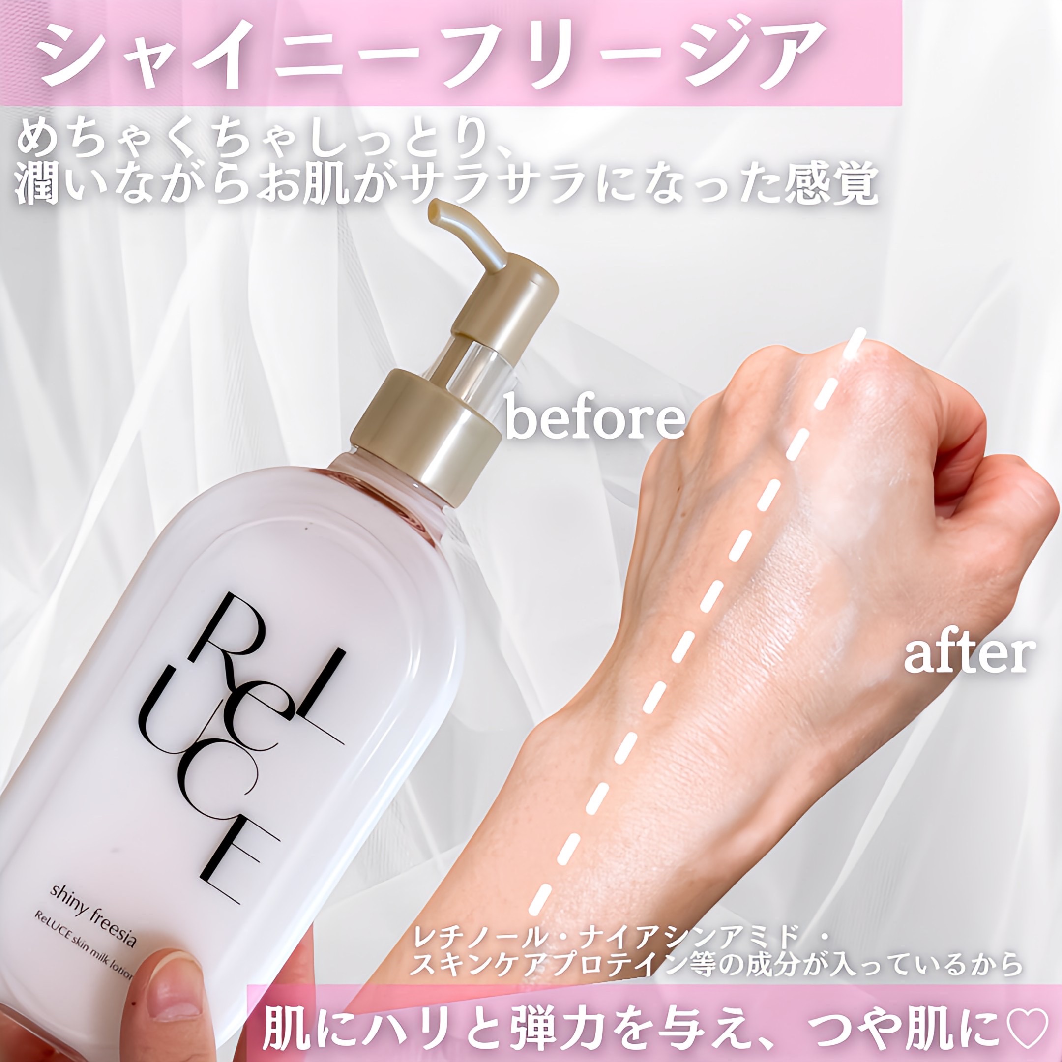香水のような上品な香りのスキンミルクローションが登場したよ🤍🤍 シャイニーフリージアは私が大好きな香りで私の持っているハイブランドの香水に似てるの🩷🤍 いい香りなのにしっかり保湿だけじゃなくてケアできるのも嬉しいポイント!·͜·✌︎´-