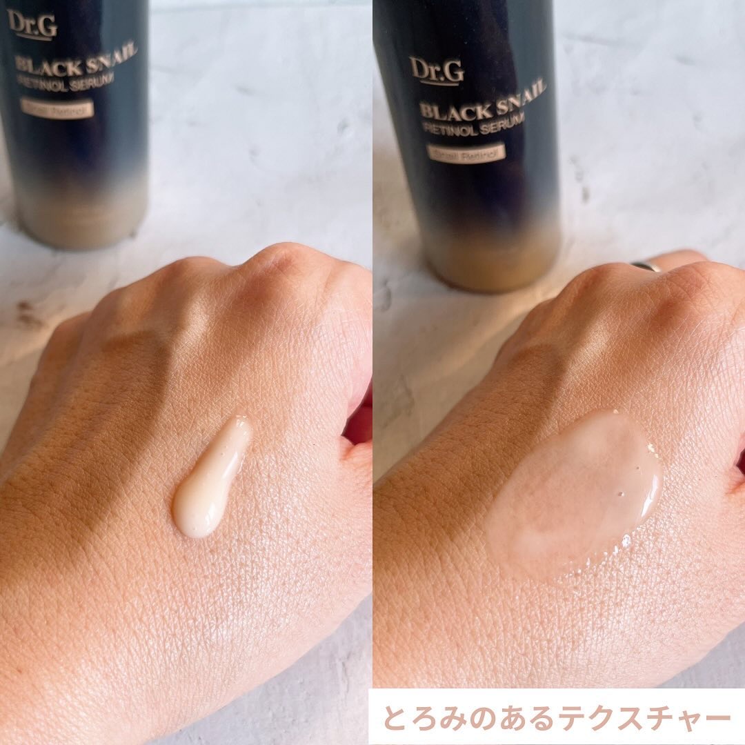 - ブラックスネイル*とレチノール*を配合した、若々しい肌印象に導く美容液です。 Dr.Gのレチノールは独自の成分である、ブラックスネイルレチノール*を使っています! 肌に高い保湿感を与え、肌のキメを整え、弾力やハリのケアを助けるだけでなく、肌の乾燥くすみをケアし、明るい印象のぷるんっとハリのある肌に導きます。 *整肌成分