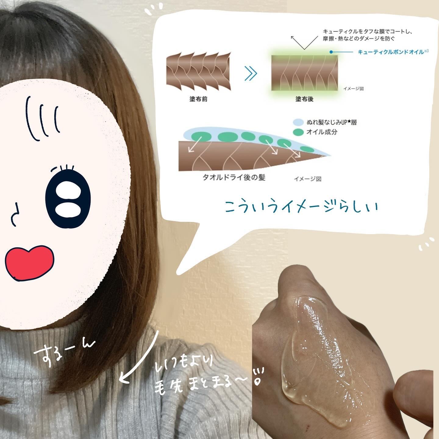 キューティクルボンドオイル*が広がったキューティクルをボンドのようにタフな膜でコート! 摩擦や熱などのダメージを防いで、枝毛、切れ毛も防いでくれるんだって✨ むちっとしたテクスチャーのオイルなのに濡れた髪につけて乾かすとさらっとした仕上がり✨