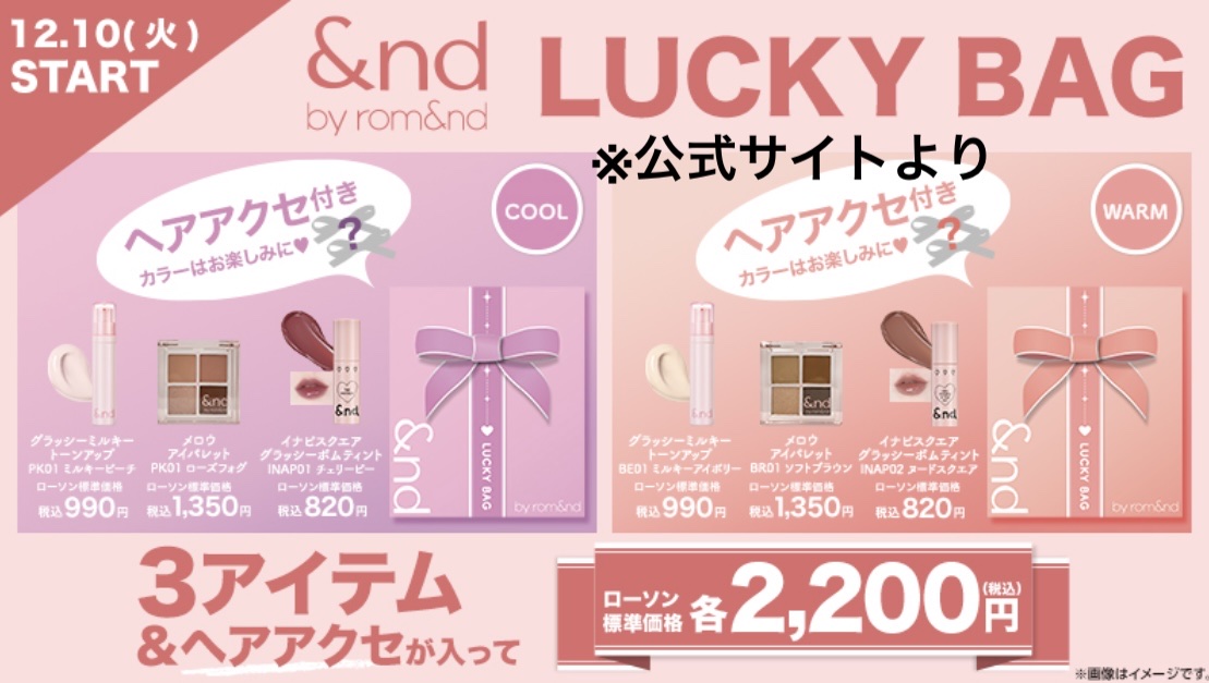 ローソンでロムアンドの福袋が2,200円で買える😳 しかも、イエベ用とブルベ用の2パターン!! LUCKY BAG WARM(イエベSET) ✔︎グラッシーミルキートーンアップBE01ミルキーアイボリー990円(税込) LUCKY BAG COOL(ブルベSET) ✔︎グラッシーミルキートーンアップPK01ミルキーピーチ990円(税込)