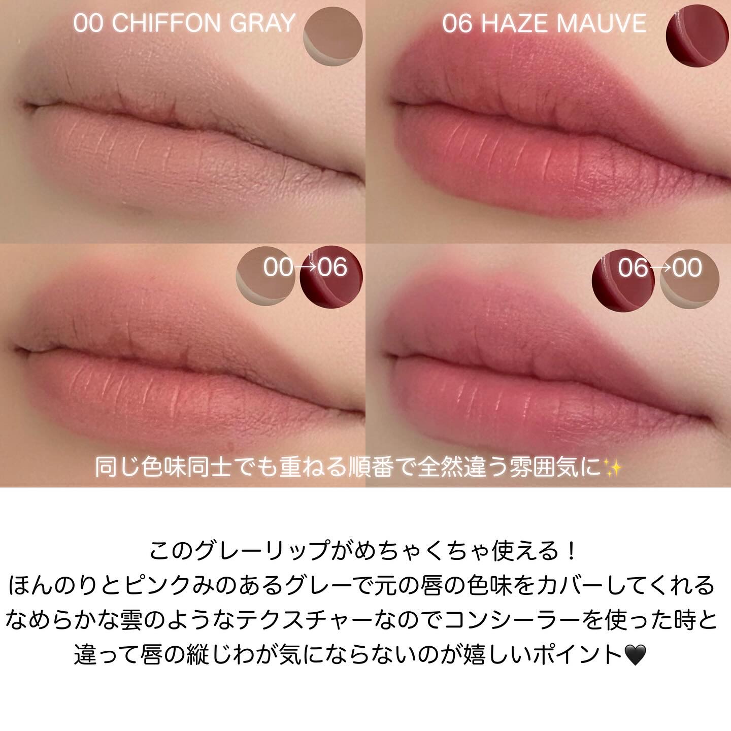 雲のようなふわふわさらさらのテクスチャで、マットな仕上がりが特徴のリップクリームです。 持ち運びやすい大きさなので私はお直し用にしたいかなと思います! 00番のシフォングレーは、唇のトーンを均一に整えてくれるベースリップとのこと。