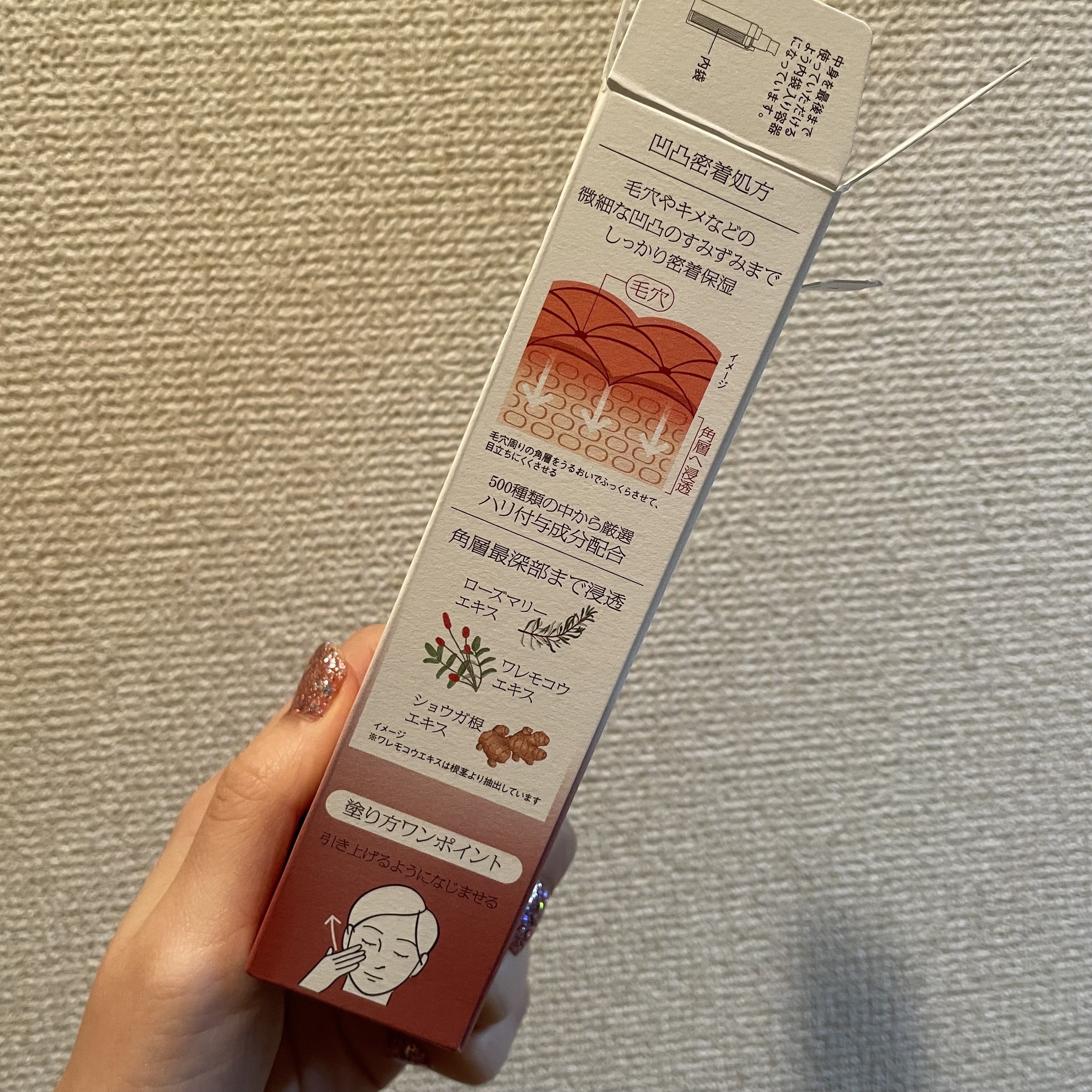 - 毛穴・キメなど凹凸のすみずみまで密着保湿し、肌にハリを与え、毛穴が目立ちにくいなめらかな素肌に導くハリ弾力注入美容液。 凹凸密着処方で、毛穴やキメなどの微細な凹凸のすみずみまでしっかり密着保湿。(毛穴周りの角層をうるおいでふっくらさせて、目立ちにくくさせる) 500種類の中から厳選したハリ付与成分(ローズマリーエキス・ワレモコウエキス・ショウガ根エキス)配合。角層深部まで浸透。