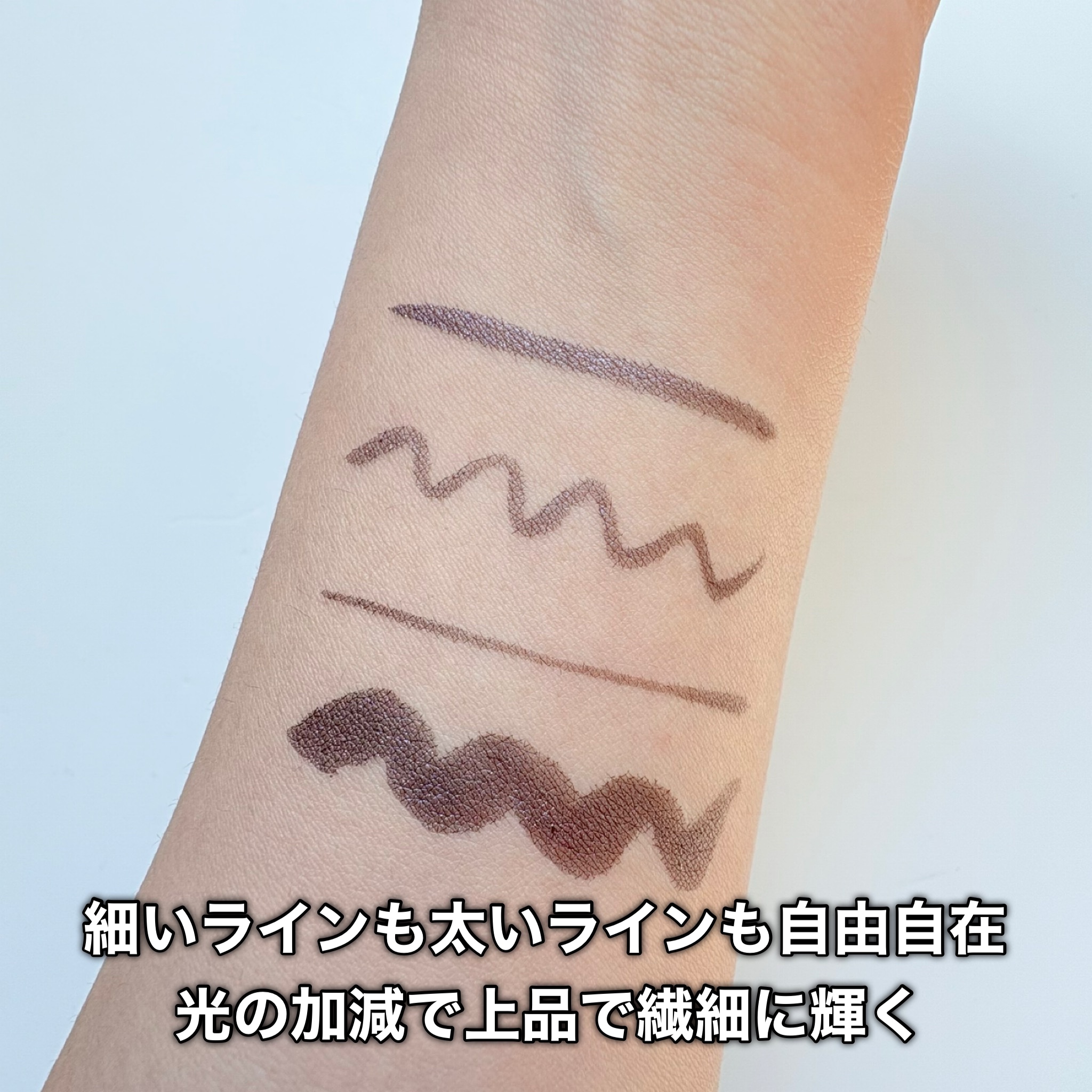 - 筆先までずっとなめらか、目尻で感動するリキッドアイライナー。 必要な量が肌にのる新設計で、まぶたの上をすべるような、滑らかな描き心地。しなやかでコシのある筆が、筆圧のコントロールを容易にし、太いラインも細いラインも思い通りに仕上げます。水、汗、涙に強いウォータープルーフタイプなのに、通常洗顔で簡単オフ。肌に色素が残らない顔料を使用。5種類の美容液成分を従来品の200%配合し、メイクしながら目元ケアまで。 ●ブラウンブラック ※2020年9月12日 バラエティショップ先行発売 ●漆黒ブラック ※2020年12月頃発売予定 ●ナチュラルブラウン ※2020年12月頃発売予定 ●シフォンブラウン 「毎日メイクに透明感と抜け感」 ブラウンでも、グレーでも、ベージュでもないニュアンスカラー。 自然な印影で素の目元を際立て、頑張りすぎない、ふんわりとした目元に。 ●アプリコットブラウン 「じゅわっと血色感。 肌に馴染むおしゃれカラー」 温かみのあるアプリコットがじゅわっと滲む血色感を目元に演出。 肌馴染みが良いので、カラーライナーに抵抗がある方もブラウンの延長線上で楽しめる、使いやすい色味です。 ”ちょっとオシャレ”な空気感を演出するカラー。 ●ピンクショコラ アイライナー 「ピンクが溶け込む濃厚ブラウン」 肌馴染みが良く、目元にじんわり血色感をプラス。 さりげなく女性らしさが加速するようなカラー。 ●ピスタチオラテ (2022年7月29日(金)発売) 「“目尻”に抜け感アクセント」 肌に馴染むのに映える絶妙なグリーン。 トレンドカラーに“くすみ”と“抜け感”をプラスしたまろやかな発色。 ●マスタードブラウン 「“イエロー”が揺れる、大人の洒落色」 (2022年7月29日(金)発売) まるで太陽のような暖かさを感じる新しいブラウン。 ほんのり感じるイエローでメイクが一気に垢抜ける稀有な色。 ●シフォンピンク(2023年2月10日発売) 「ふんわり柔らか"まろみピンク"」 甘くなりすぎない青みニュアンスで目元の透明感UP。 目元を引き締め、ピンクメイクにありがちな腫れぼったさを解消。 ●ミルクカプチーノ(2023年4月21日発売) まろやかな深みの“優しい締め色” どんなメイクにも合わせやすいカラー。 自然な陰影でさりげなく目幅を拡張します。 ●グレーカシミア(2023年10月1日発売) ブラウンがほんのり溶け込んだ、暖色グレー まろやかな発色で、パーソナルカラーを問わず肌に馴染む 目元の陰影になりすまし、抜け感と目力を欲張りに叶える ●ダークフィグ(2024年6月1日発売) するする”なめらか。描きやすいのに、落ちにくい。 クッキリ可愛いほの甘ダークブラウン ●ピーチモカ(2024年8月1日発売) ふわっと自然に盛れる“桃色ブラウン” ほんのり血色感で目元にうるみ感を演出 ●スターダストブラウン(2024年12月11日発売) キラッと繊細に輝く''星屑ブラウン'' 透け感のあるダークブラウンの色味とラメの輝きが、目元に艶のある立体感を演出 ●チャコールモカ(2025年4月10日発売) 目元を締める''深みグレージュ'' 黄みや赤みに偏りすぎない絶妙な色設計で、自然に目元を強調