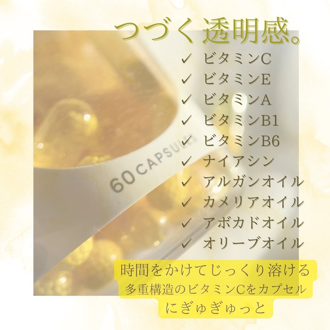 - 時間をかけてじっくり溶ける多重構造のビタミンCビーズをカプセルにぎゅっと詰め込みました。また、美容にうれしいアルガンオイル、カメリアオイル、アボカドオイル、オリーブオイルにビタミンE・ビタミンAも同時に摂れる美容液設計のカプセルです。 キレイ習慣をサポートする、栄養機能食品です。 【栄養機能食品(ビタミンC・ビタミンE)】 ビタミンCは、皮膚や粘膜の健康維持を助けるとともに、抗酸化作用を持つ栄養素です。 ビタミンEは、抗酸化作用により、体内の脂質を酸化から守り、細胞の健康維持を助ける栄養素です。 ●本品は、多量摂取により疾病が治癒したり、より健康が増進するものではありません。 ●1日の摂取目安量を守ってください。 ●本品は、特定保健用食品と異なり、消費者庁長官による個別審査を受けたものではありません。 ●食生活は、主食、主菜、副菜を基本に、食事のバランスを。