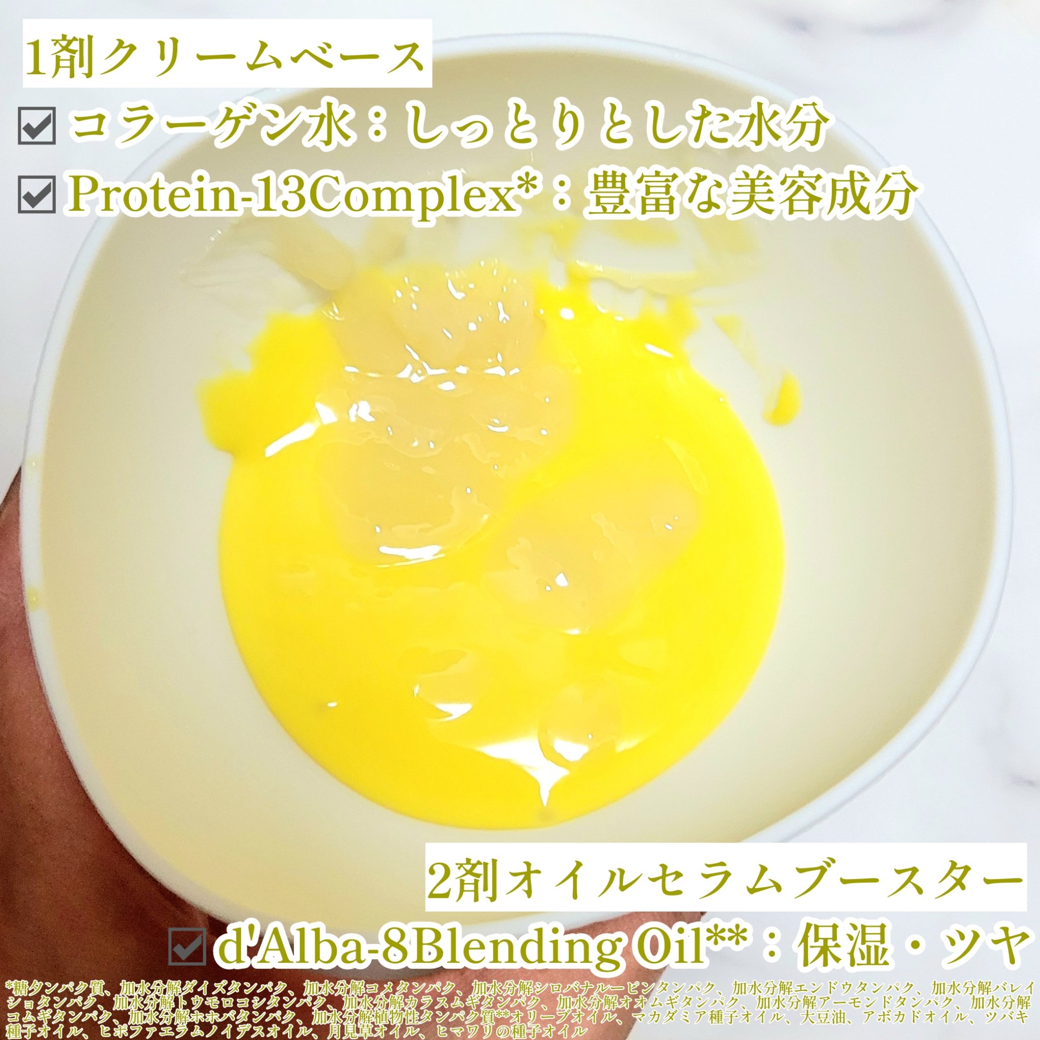 - 1剤:水、ケイソウ土、グリセリン、BG、アルギン酸Na、 PEG-75、1,2-ヘキサンジオール、ピロリン酸4Na、ツベルマグナツムエキス、トコフェロール、ヒドロキシアセトフェノン、ヒアルロン酸Na、コラーゲン水、 CI 77492、EDTA-2Na、リボフラビン、β-グルカン、加水分解ダイズタンパク、加水分解コメタンパク、加水分解シロバナルーピンタンパク、加水分解エンドウタンパク、加水分解バレイショタンパク、加水分解トウモロコシタンパク、加水分解カラスムギタンパク、加水分解オオムギタンパク、加水分解アーモンドタンパク、加水分解コムギタンパク、加水分解ホホバタンパク、加水分解野菜タンパク、糖タンパク、ヨモギ葉エキス、カワラヨモギエキス、ドクダミエキス、スピルリナプラテンシスエキス、クロレラエキス、グルコース、マンノース、香料 2剤:ケイソウ土、マカデミア種子油、ヒマワリ種子油、ダイズ油、トリ(カプリル酸/カプリン酸)グリセリル、ポリソルベート80、ベヘニルアルコール、ステアリン酸グリセリル、硫酸Ca、1,2-ヘキサンジオール、ピロリン酸4Na、レシチン、ツベルマグナツムエキス、トコフェロール、月見草油、ツバキ種子油、アボカド油、オリーブ果実油、ダイズステロール、酢酸トコフェロール、ヒポファエラムノイデス油、水、BG、香料