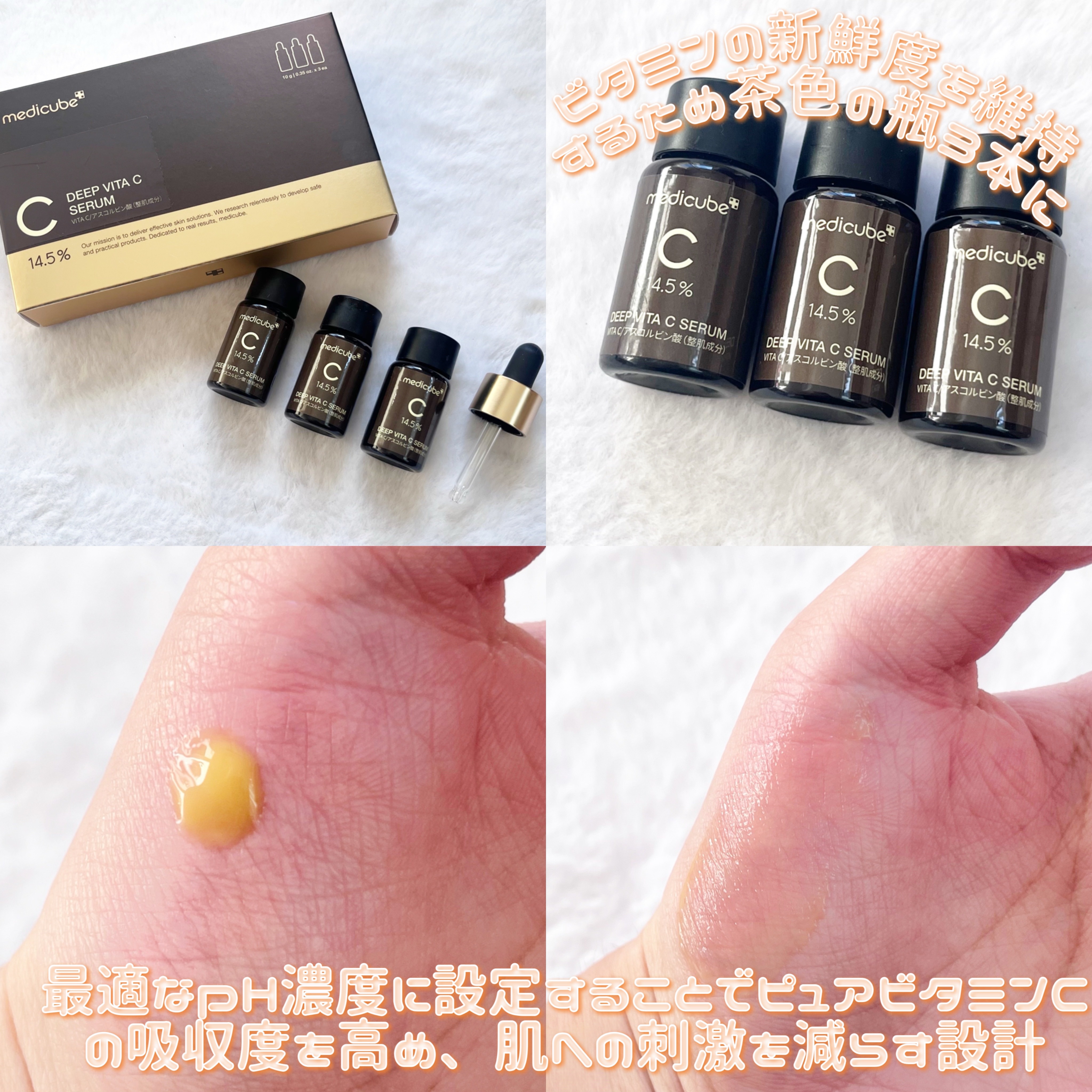 - 高濃縮のピュアビタミンC*やグルタチオン*をたっぷり配合した美容液です。 べたつかないテクスチャーで肌を保湿し、ツヤのある美肌に導きます。 ☑ピュアビタミンC* 145,000ppm配合 ☑独自整肌成分MELA-FADE ☑ナチュラルビタコンプレックス:カムカムの実エキス*・ビタミンツリーウォーター*・カカドゥプラムエキス*配合 ☑ビタミンの鮮度を維持するため、茶色の瓶3本に小分けしたパッケージを採用 ☑肌の角質層により浸透されやすい、こだわりのpH濃度(pH4.0以下)に設定 ☑乾燥によるくすみケア/弾力ケア/保湿ケア/肌キメケア 化粧水などでお肌を整えたあと、適量を取り、お肌のキメに沿ってまんべんなく塗った後、やさしくなじませます。 * 保湿成分 ■お肌に異常が生じていないかよく注意してご使用ください。化粧品がお肌に合わないとき即ち次のような場合には、使用を中止してください。そのまま使 用を続けますと、症状を悪化させることがありますので、皮膚科専門医等にご相談されることをおすすめします。また、傷やはれもの、しっしん等の異常が ある部位には、ご使用にならないでください。 (1)使用中、赤み、はれ、かゆみ、刺激、色抜け(白斑等)や黒ずみ等の異常があらわれた場合 (2)使用したお肌に、直射日光があたって上記のような異常があらわれた場合 ■目に入らないようご注意ください。目に入ったときは、こすらずにすぐに洗い流してください。その後、目に異常が残る場合は、眼科専門医へご相談され ることをおすすめします。 ■極端に高温又は低温の場所、低湿、高湿の場所、直射日光のあたる場所には保管しないでください。 ■衣類につくと、しみになることがございますのでご注意ください。 ■乳児、子供の手の届かない所に保管してください。