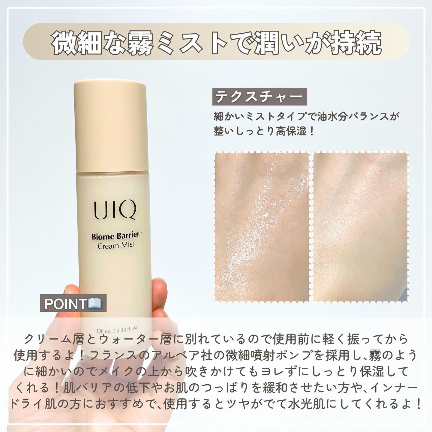 UIQが独自開発したスキンマイクロバイオーム由来の原料である、CutiBiom TM(※1)とフルクタン(※2)、プロテアーゼ(※3)、乳酸菌発酵エキス(※4)等が含有され、長時間肌にしっとりさを与えてくれるクリームミストです。 クリーム層と水分層が同時に繊細な粒子で噴出され、素早い保湿と自然な潤いをあたえてくれます。