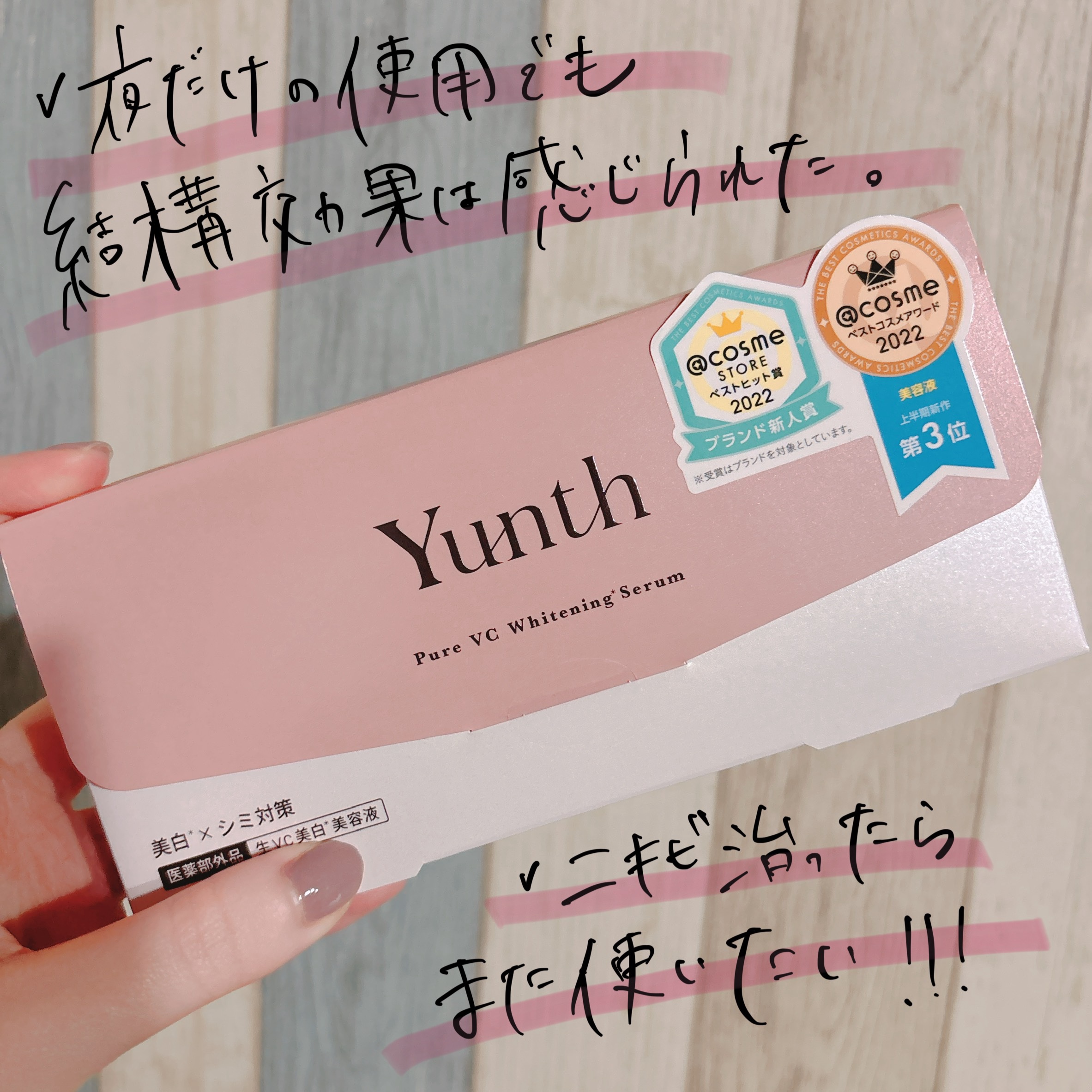 Yunth生VC美白*美容液個包になった導入美容液で1ml入りが28包入っており、普段使いだけでなく、旅行先などでも使える医薬部外品の商品です。使用期限が"開封後30秒"というフレッシュさを感じさせるキャッチフレーズも印象的で、肌に乗せるとじ...