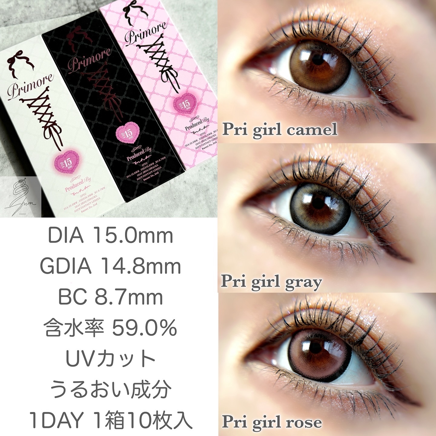 着色直径14.8mmでもかなり大きめですが、日本初の14.8mmサイズは衝撃的でした💥 細フチで儚く盛れる王道ブラウン。瞳に馴染みやすいブラウンとデザインで使いやすい✌🏻 黒の太フチでくりっと盛れる多幸感たっぷりの愛されピンク🎀 大人っぽいピンクなのでメイクとの相性も抜群◎