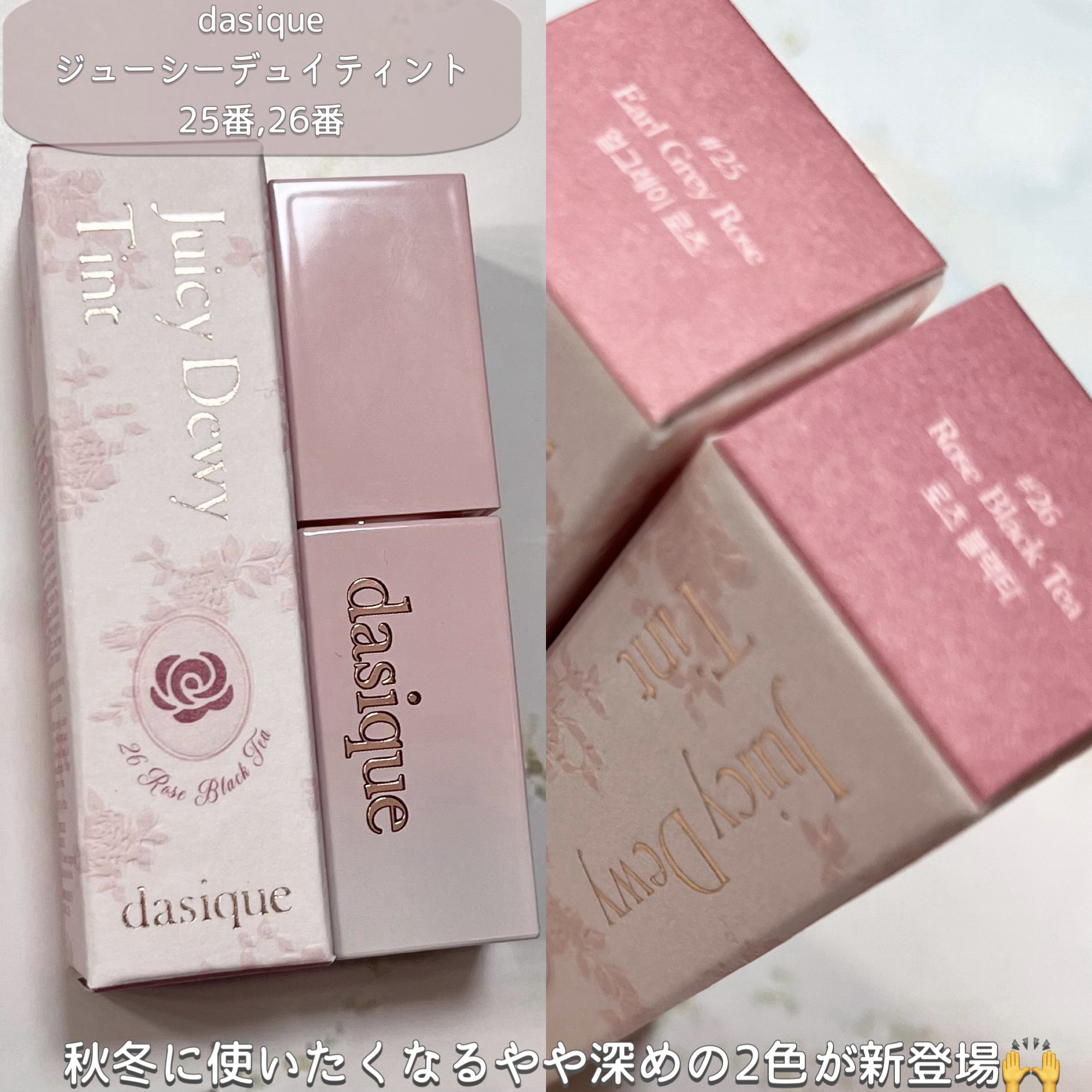 シャドウパレット 27番ローズミルクティー 上段のほうは白みがあり、青みも感じる。下段の方にいくにつれ、だんだんくすみが強めに出てきて、青みは少し弱くなってくる感じ。 白桃ウーロン系メイクが好きな方に推したい!ラメが入っているものは2色で、どちらもチラチラとした微細なラメ。 ジューシーデュイティント 25アールグレイローズ 25は、公式の唇の画像より青みがありました。ブルベ夏、イエベ秋の方が得意そう。
