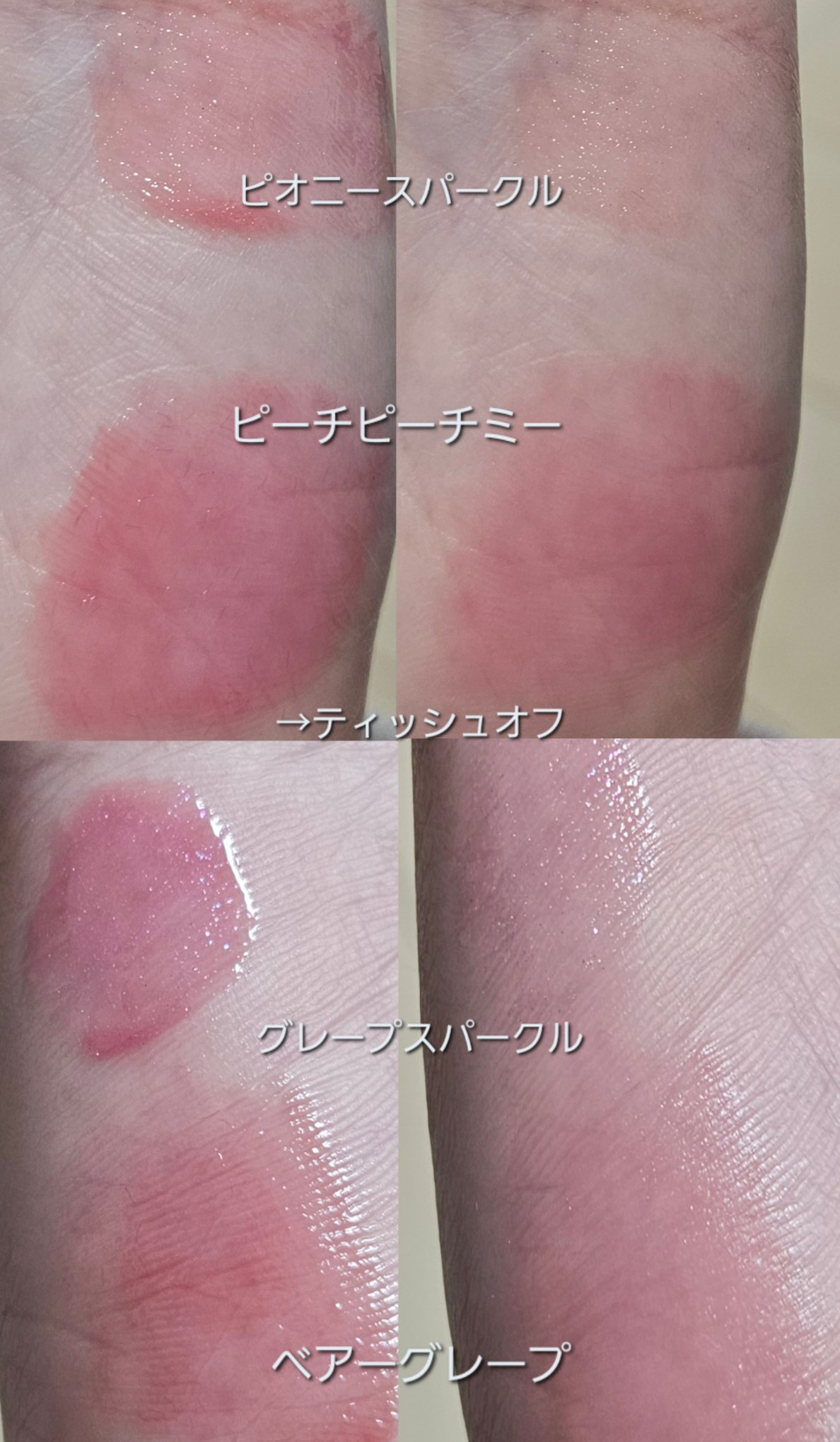 - <03 ベアーグレープ> 水、オクチルドデカノール、変性アルコール、ポリソルベート60、トリメチルシロキシフェニルジメチコン、エチルセルロース、ベヘニルアルコール、ペンチレングリコール、ダイマージリノール酸ジ(イソステアリル/フィトステリル)、アクリレーツコポリマー、シリカ、ステアリン酸ソルビタン、(アクリル酸Na/アクリロイルジメチルタウリンNa)コポリマー、フェノキシエタノール、イソヘキサデカン、リンゴ酸ジイソステアリル、酸化チタン、ステアリン酸グリセリル、ステアリン酸PEG-100、トリイソステアリン酸ポリグリセリル-2、ポリソルベート80、酸化鉄、香料、オレイン酸ソルビタン、エチレンジアミンジコハク酸3Na、エチルヘキシルグリセリン、赤227、赤202、黄5、ジイソステアリン酸ポリグリセリル-2、ベンジルアルコール、赤104(1)、リナロール、青1、マンゴー種子脂、プルーン種子エキス、(ラズベリー種子油/コハク酸トコフェロール)アミノプロパンジオールエステルズ、BG、1,2-ヘキサンジオール、ヒアルロン酸ジメチルシラノール、加水分解ヒアルロン酸、加水分解ヒアルロン酸Na、ヒアルロン酸、ヒアルロン酸K、ヒアルロン酸Na、ヒアルロン酸ヒドロキシプロピルトリモニウム、ヒアルロン酸クロスポリマーNa、ヒアルロン酸ジメチルシラノールNa、アセチルヒアルロン酸Na <18 ジュジュブジャム(日本限定)> 水、オクチルドデカノール、変性アルコール、ポリソルベート60、トリメチルシロキシフェニルジメチコン、エチルセルロース、ベヘニルアルコール、ペンチレングリコール、ダイマージリノール酸ジ(イソステアリル/フィトステリル)、アクリレーツコポリマー、シリカ、ステアリン酸ソルビタン、(アクリル酸Na/アクリロイルジメチルタウリンNa)コポリマー、トリイソステアリン酸ポリグリセリル-2、イソヘキサデカン、フェノキシエタノール、ステアリン酸グリセリル、酸化鉄、ステアリン酸PEG-100、リンゴ酸ジイソステアリル、ポリソルベート80、赤227、オレイン酸ソルビタン、香料、赤202、黄5、エチレンジアミンジコハク酸3Na、ジイソステアリン酸ポリグリセリル-2、エチルヘキシルグリセリン、青1、ベンジルアルコール、黄4、リナロール、マンゴー種子脂、プルーン種子エキス、(ラズベリー種子油/コハク酸トコフェロール)アミノプロパンジオールエステルズ、BG、1,2-ヘキサンジオール、ヒアルロン酸ジメチルシラノール、加水分解ヒアルロン酸、加水分解ヒアルロン酸Na、ヒアルロン酸、ヒアルロン酸K、ヒアルロン酸Na、ヒアルロン酸ヒドロキシプロピルトリモニウム、ヒアルロン酸クロスポリマーNa、ヒアルロン酸ジメチルシラノールNa、アセチルヒアルロン酸Na <20 ジュジュフィグ> 水、オクチルドデカノール、変性アルコール、ポリソルベート60、トリメチルシロキシフェニルジメチコン、エチルセルロース、ベヘニルアルコール、ペンチレングリコール、ダイマージリノール酸ジ(イソステアリル/フィトステリル)、アクリレーツコポリマー、シリカ、ステアリン酸ソルビタン、(アクリル酸Na/アクリロイルジメチルタウリンNa)コポリマー、イソヘキサデカン、フェノキシエタノール、リンゴ酸ジイソステアリル、酸化チタン、ステアリン酸グリセリル、ステアリン酸PEG-100、ポリソルベート80、トリイソステアリン酸ポリグリセリル-2、酸化鉄、赤202、香料、オレイン酸ソルビタン、赤227、ジイソステアリン酸ポリグリセリル-2、黄5、エチレンジアミンジコハク酸3Na、エチルヘキシルグリセリン、赤104(1)、ベンジルアルコール、青1、リナロール、マンゴー種子脂、プルーン種子エキス、(ラズベリー種子油/コハク酸トコフェロール)アミノプロパンジオールエステルズ、BG、1,2-ヘキサンジオール、ヒアルロン酸ジメチルシラノール、加水分解ヒアルロン酸、加水分解ヒアルロン酸Na、ヒアルロン酸、ヒアルロン酸K、ヒアルロン酸Na、ヒアルロン酸ヒドロキシプロピルトリモニウム、ヒアルロン酸クロスポリマーNa、ヒアルロン酸ジメチルシラノールNa、アセチルヒアルロン酸Na <21 グレープボム> 水、オクチルドデカノール、変性アルコール、ポリソルベート60、トリメチルシロキシフェニルジメチコン、エチルセルロース、ベヘニルアルコール、ペンチレングリコール、ダイマージリノール酸ジ(イソステアリル/フィトステリル)、アクリレーツコポリマー、シリカ、ステアリン酸ソルビタン、(アクリル酸Na/アクリロイルジメチルタウリンNa)コポリマー、トリイソステアリン酸ポリグリセリル-2、イソヘキサデカン、フェノキシエタノール、赤227、ステアリン酸グリセリル、ステアリン酸PEG-100、ポリソルベート80、リンゴ酸ジイソステアリル、酸化鉄、酸化チタン、香料、オレイン酸ソルビタン、赤104(1)、エチレンジアミンジコハク酸3Na、エチルヘキシルグリセリン、黄5、黄4、ベンジルアルコール、青1、リナロール、マンゴー種子脂、プルーン種子エキス、(ラズベリー種子油/コハク酸トコフェロー