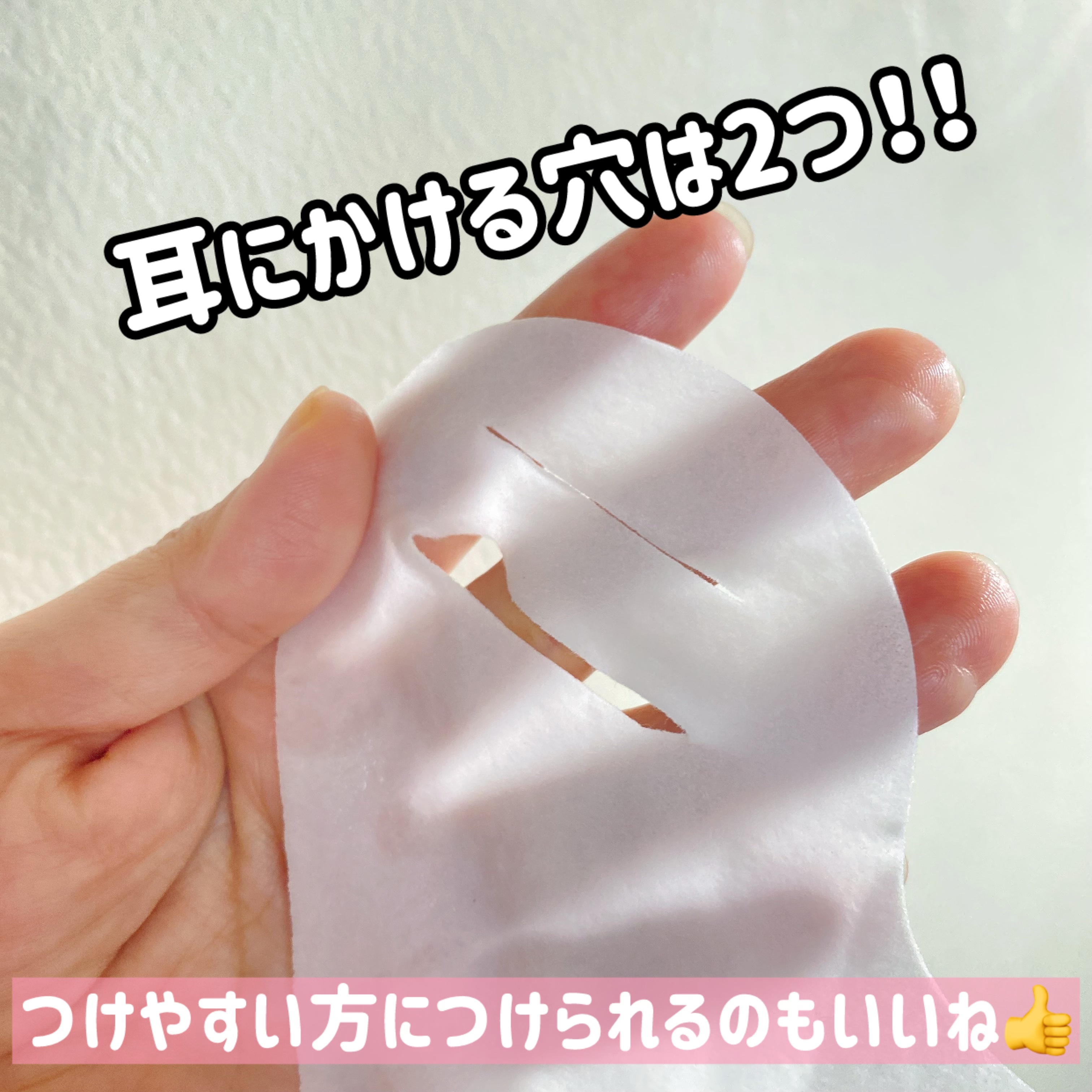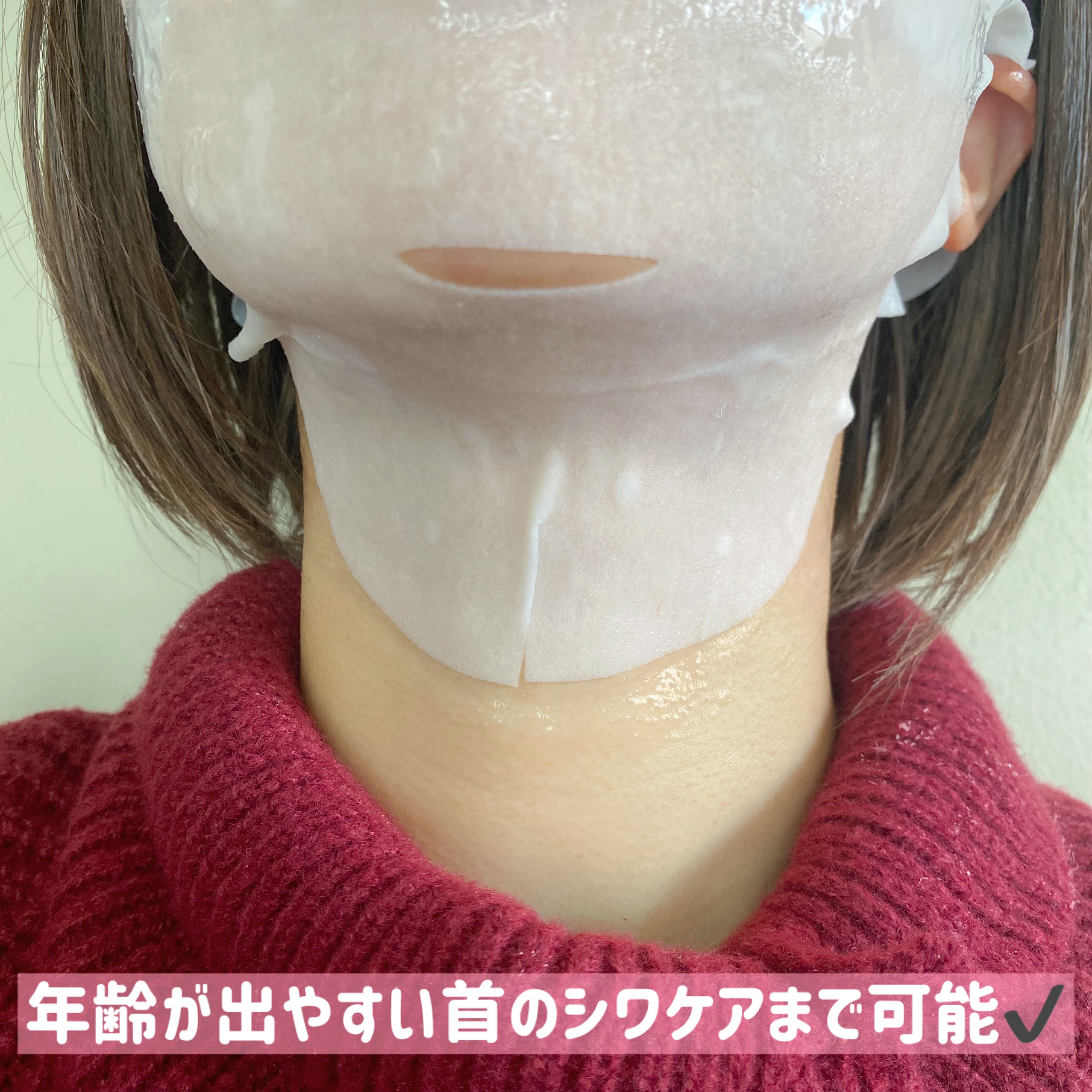 上下でシート、エッセンスが異なるセパレートタイプのマスクです。上のシートは、NMNエッセンスたっぷり。NMNとは、老化を遅らせる成分です。肌あたりがやわらかいシート。長めにつけても乾かなかったです。しっとりした使用感です。 下のシートは、溶ける糸PLA成分配合です。耳にかけて使います。小顔リフトバンドつきでフェイスラインがキュッと引き締まるよう使用感です。首までケアできる形になっています。