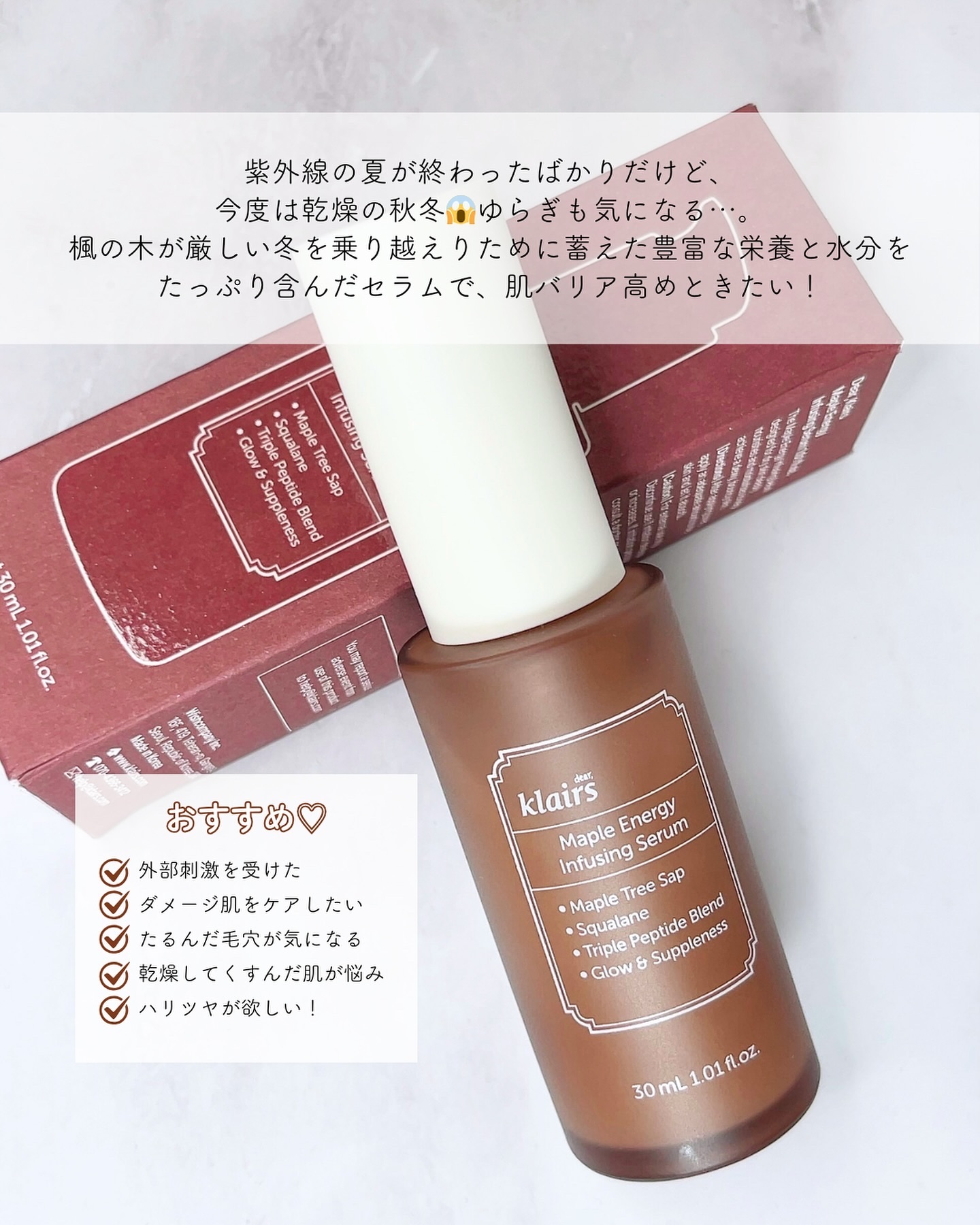 #PRクレアス(@klairs_jp)・メープル毛穴シロップセラム・メープル3Dバリアクリームをお試しさせていただきました✨【メープルライン】で、お肌のハリと弾力UP!艶々の肌へ✨🍁メープル樹液とは?🍁カナダの厳しい冬を乗り越えるために蓄えて...