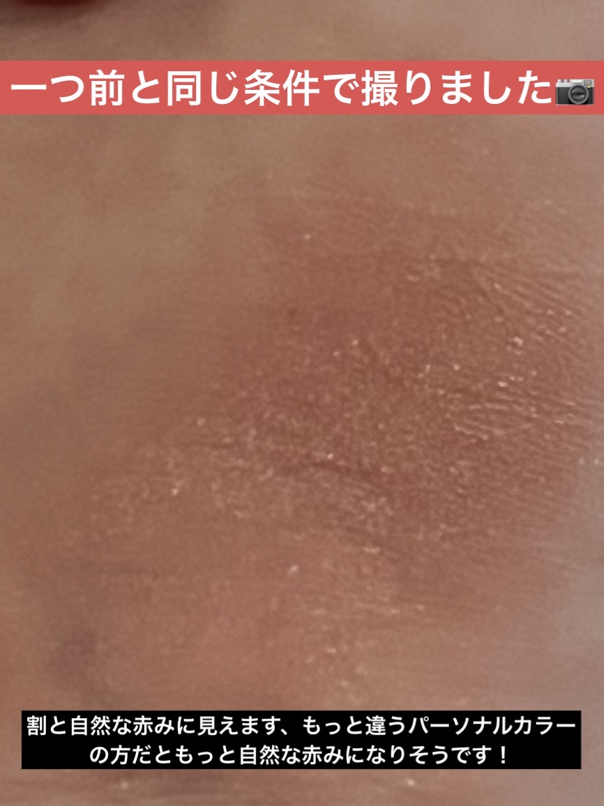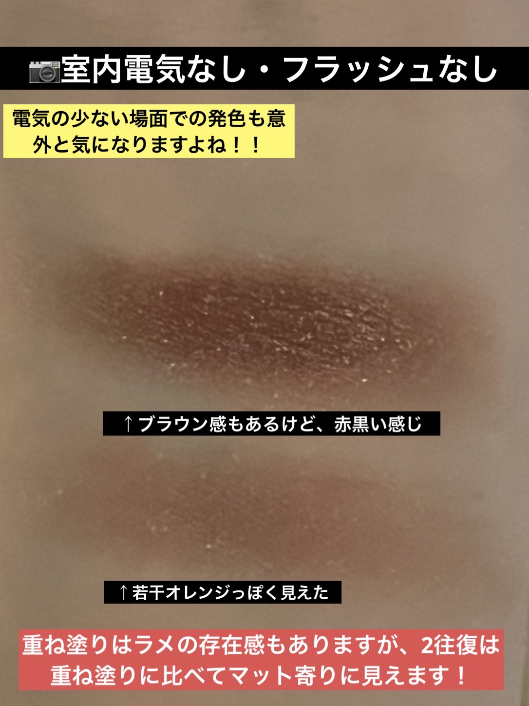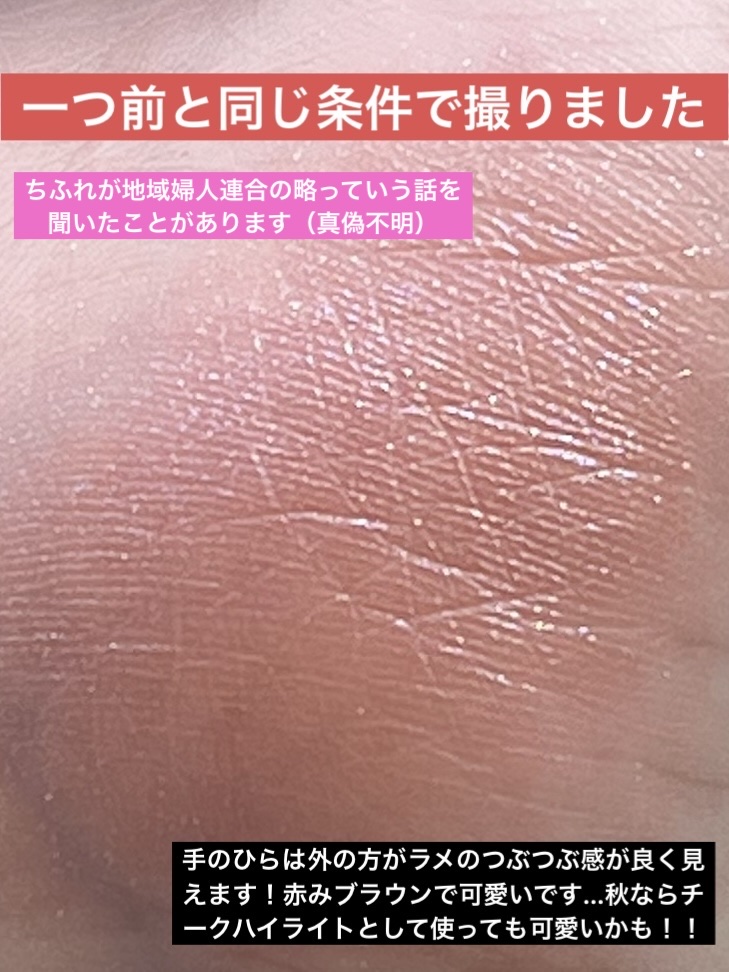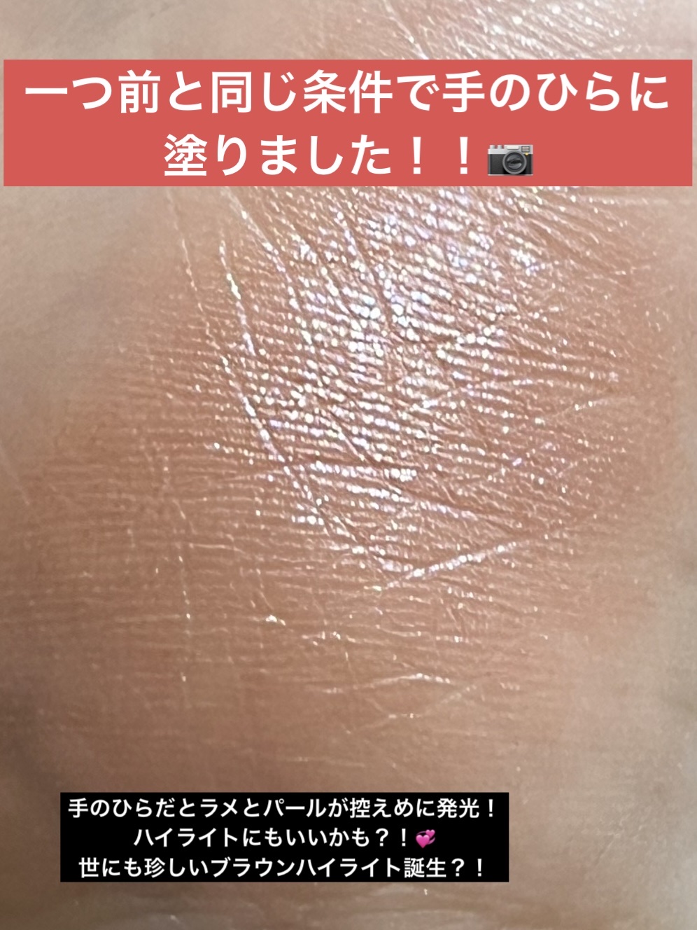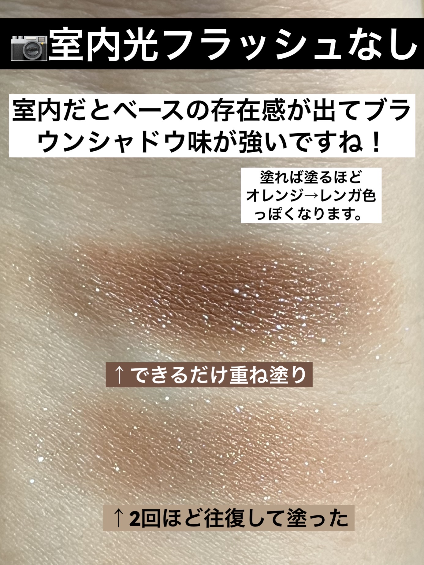 プレゼントに当選したんです!!嬉しすぎる😭 指に触れた感触はザクザク系のラメアイシャドウと近い感触でした。 私の肌(肌黄色めブルベ冬)は色味は重ねていくごとにオレンジ→レンガ色っぽく発色していきました。 マット好き×金欠+安定思考の自分では買わない色なので挑戦することができて嬉しかったです!!