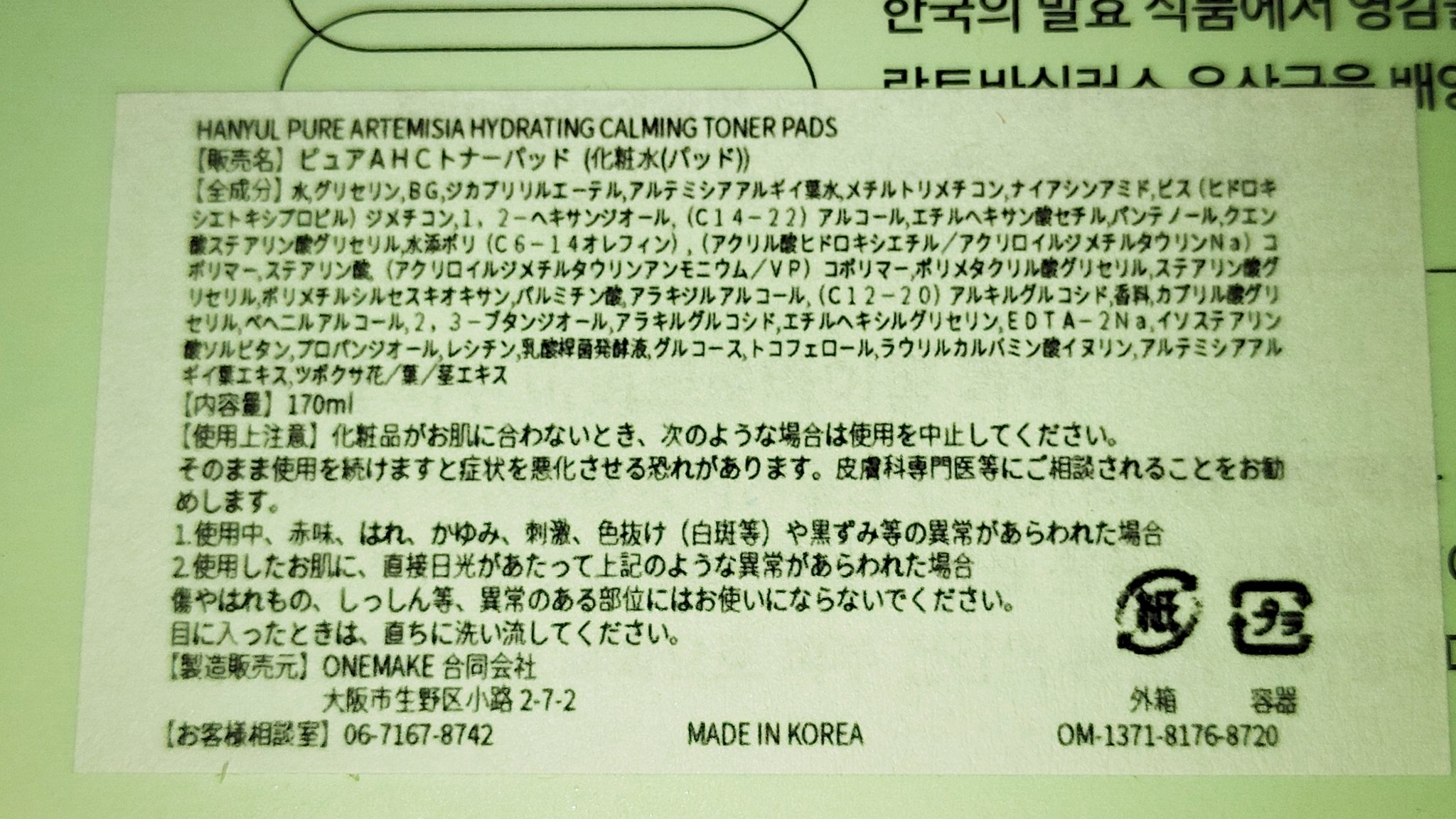 商品詳細情報HANYUL(ハンユル) ピュアアルテミシアカーミングパッド