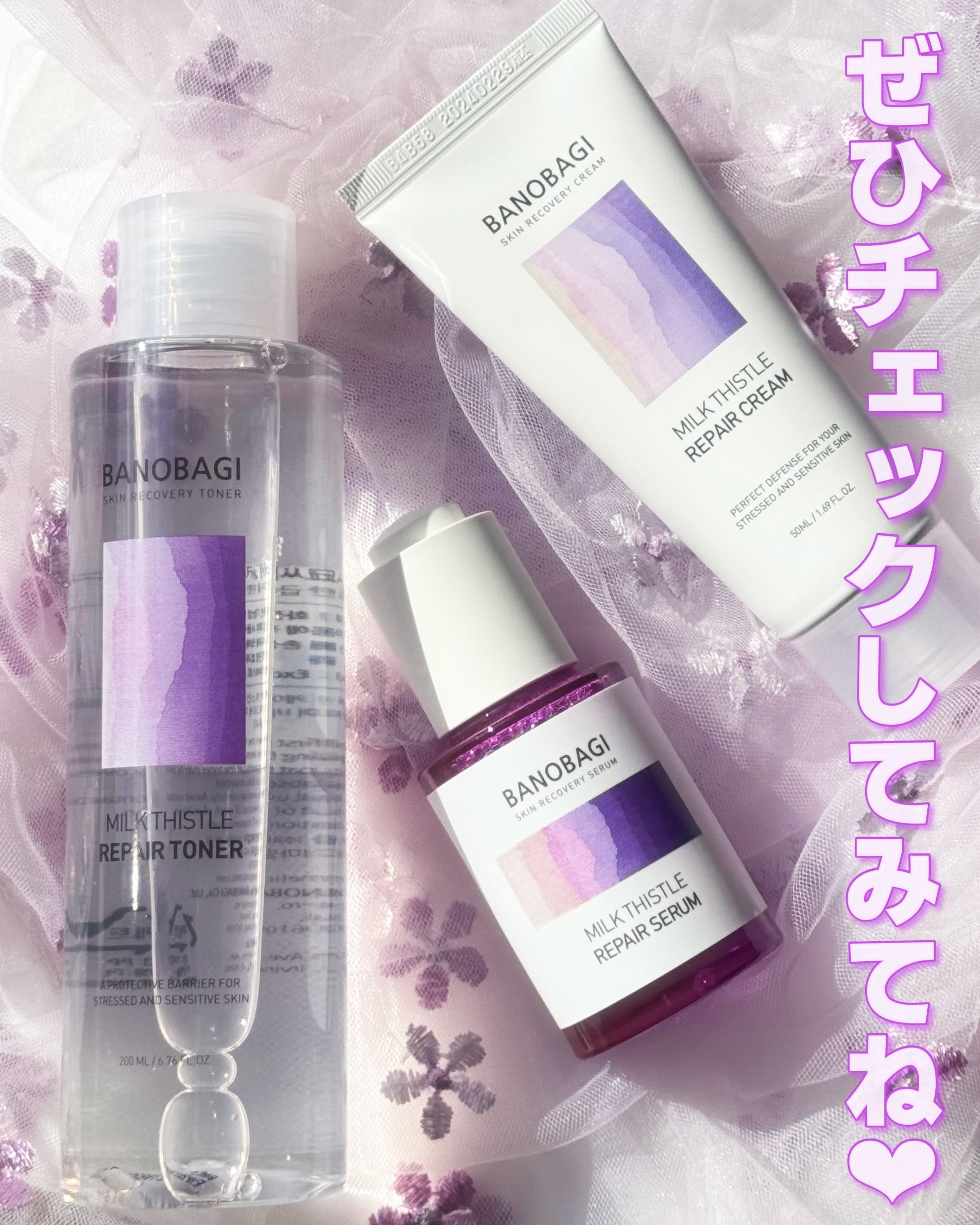 バノバギは、韓国の美容皮膚科医監修のブランドで敏感肌刺激テスト済みのため、敏感肌にも使いやすいです✧*。 ミルクシスルリペアトナー 不要なものがなくお肌を優しくケアできるトナー ひまわり種オイルを含有し、肌のバリアを強化する高保湿クリーム 少量でも伸びのよいテクスチャー
